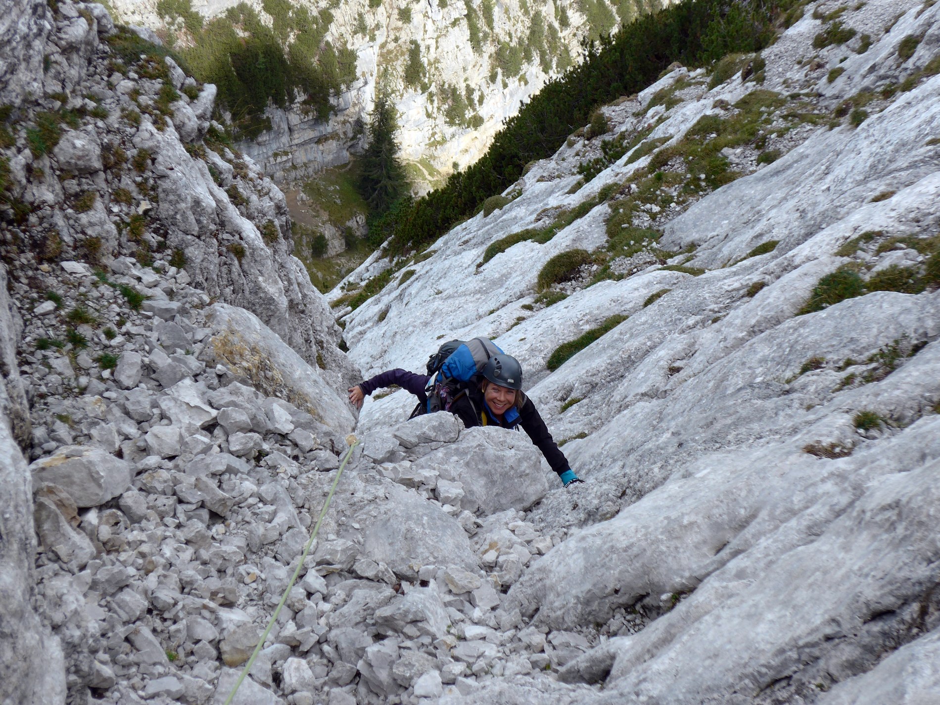 Nach einem zünftigen Hüttenabend stiegen wir am Morgen zum Einstieg der Route Herbstsunn (250 m, 3. Schwierigkeitsgrad) am Zettenkaiser auf. Der alpine Klassiker bot uns besten Klettergenuss im feinsten Kaiser-Fels.