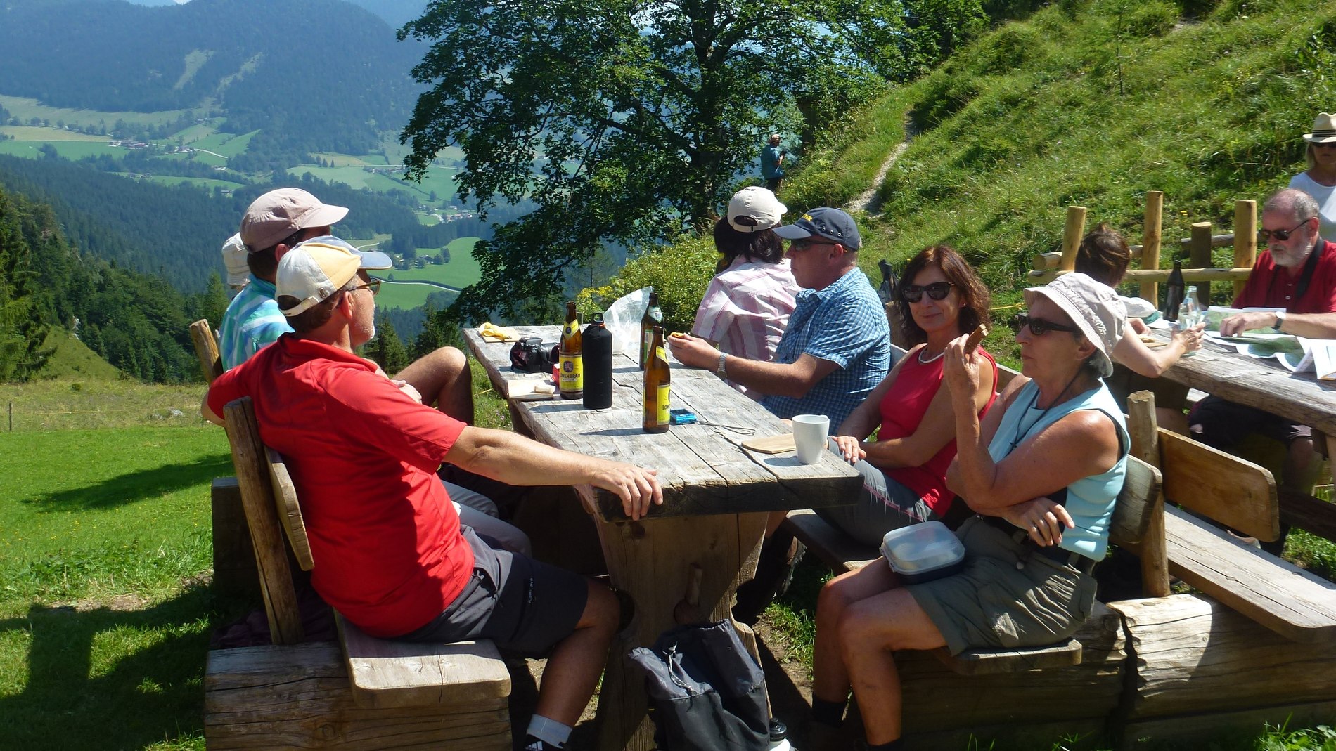 Am Gipfel wurden die prächtige Aussicht und eine ausgiebige Brotzeit genossen, um anschließend im Hirschkaser Kaffee oder Bier zu bestellen. Nach dem Abstieg ließen wir uns im Gasthaus Gerstreit von den letzten Sonnenstrahlen – die ab 17 Uhr hinter dem Bergrücken verschwanden – bescheinen und genossen nochmals Bier und Brotzeit bzw. Kaffee und Kuchen.