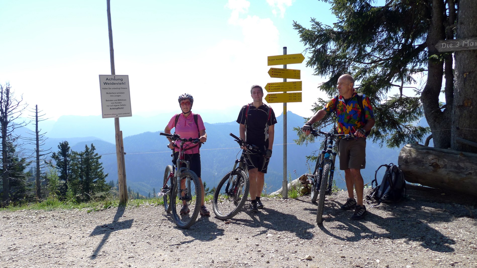 Für die Auffahrt zum Rauschberggipfel (1 645 m) gibt’s nur die Möglichkeit über den Fahrweg von Norden aus. Bei über 20 % Steigung über längere Strecken war das eine schweißtreibende Angelegenheit. Nach der Rast im Rauschberghaus machten wir uns an die Abfahrt Richtung Laubau. Wer schwere Trails mag, ist hier gut aufgehoben. Zwischendurch konnten wir auf einer Forststraße kurz ausspannen, bevor auf den letzten 300 Hm wieder volle Konzentration und gute Fahrtechnik gefragt waren.