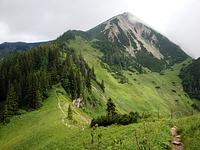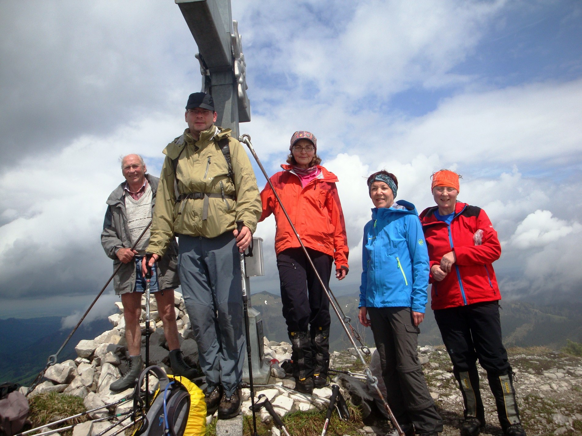 Die Anfahrt zu dieser Tour ging ja schon gut los, denn das Navi Fritz Hager führte uns von einer Umleitung zur anderen. Schließlich erreichten wir aber dann doch den Parkplatz Jochberg. Von hier ging zur Kohleralm, wo wir eine Pause einlegten. Der Anstieg ging dann über wunderschönes Almgelände weiter gegen den Gamsknogel zu, wo es dann durch steile Latschengassen auf den Gipfel ging. Hier wurde einmal mehr Brotzeit gemacht und die etwas trübe Bergwelt angeschaut.
