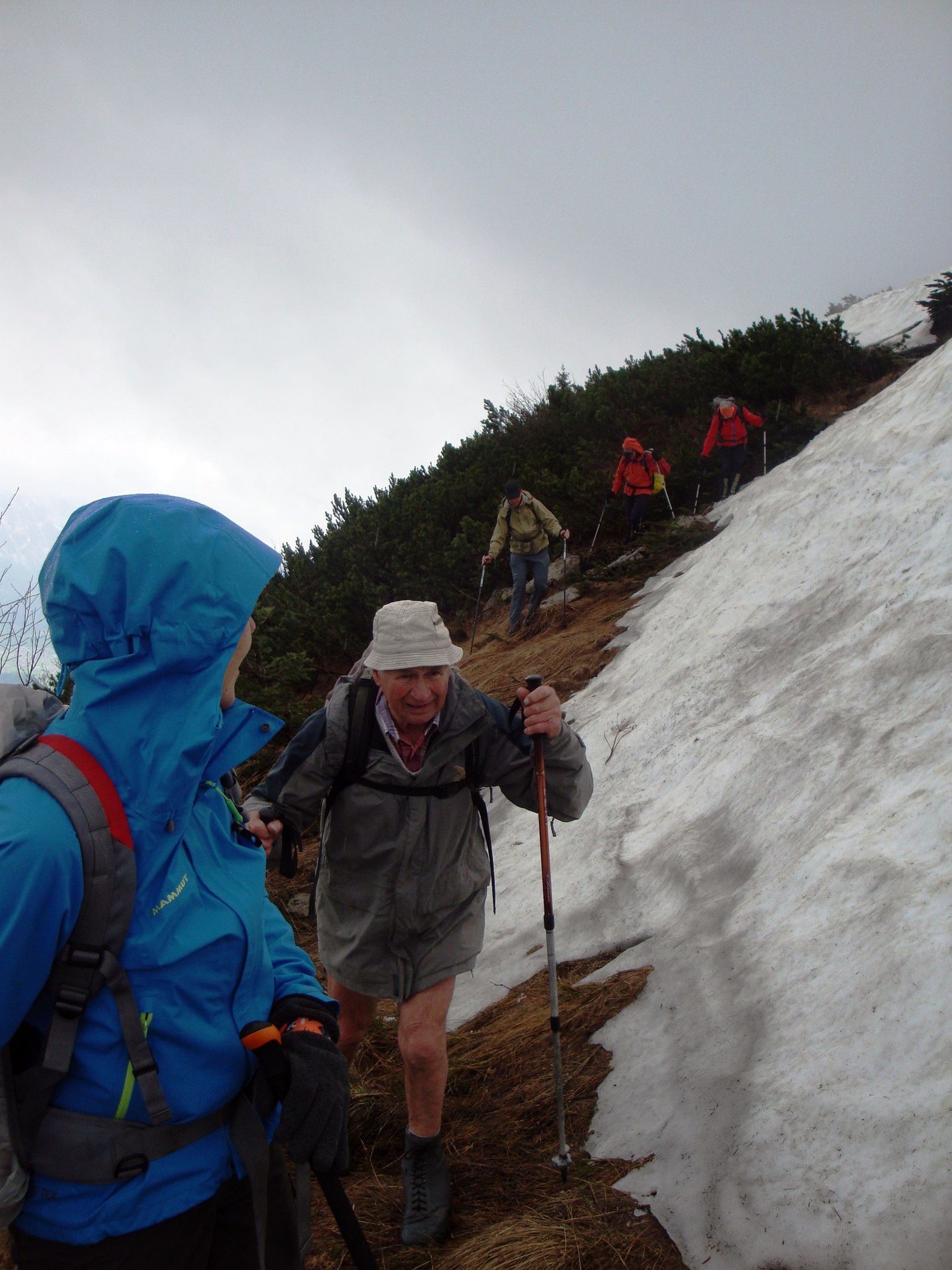 Gleich ein Stück unter dem Halleiner Haus haben wir geparkt und sind in Richtung Schlenken gewandert. Das Halleiner Haus haben wir hier gleich mal links liegen gelassen. Nachdem es schon etwas „naßkalt“ war, legte keiner einen größeren Wert auf eine lange Gipfelpause. Der Weg zum Schmittenstein war dann durchaus interessant: mal durften wir auf dem Schneegrad wandern, mal drunter. Gamaschen waren nicht nur wegen dem Schnee gut, sie haben sich auch beim Abstieg als nützlich erwiesen. Das Altschneefeld vor dem Gipfel des Schmittensteins konnten wir gut am Fels entlang umklettern. Am Gipfel des Schmittensteins hat sich der Herrgott so über uns gefreut, dass er uns die Sonne geschickt hat?. Durch den südseitigen Rückweg kamen wir über einen schönen Rundweg zum Halleiner Haus zurück, wo wir noch gemütlich eingekehrt sind. Es gab leckeren Kuchen.