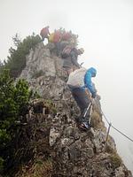 Nun kam der schönste Teil der Tour über den Grat zum Zwiesel. Hier brauchte man schon mal die Hände. Einige Drahtseile und Eisenstifte erleichterten den Übergang. Nach ca. einer Stunde erreichten wir den Zwiesel, wo es nach kurzer Rast noch schnell zum Zenokopf ging. Hier wurde noch der Übergang zum Hochstaufen angeschaut.