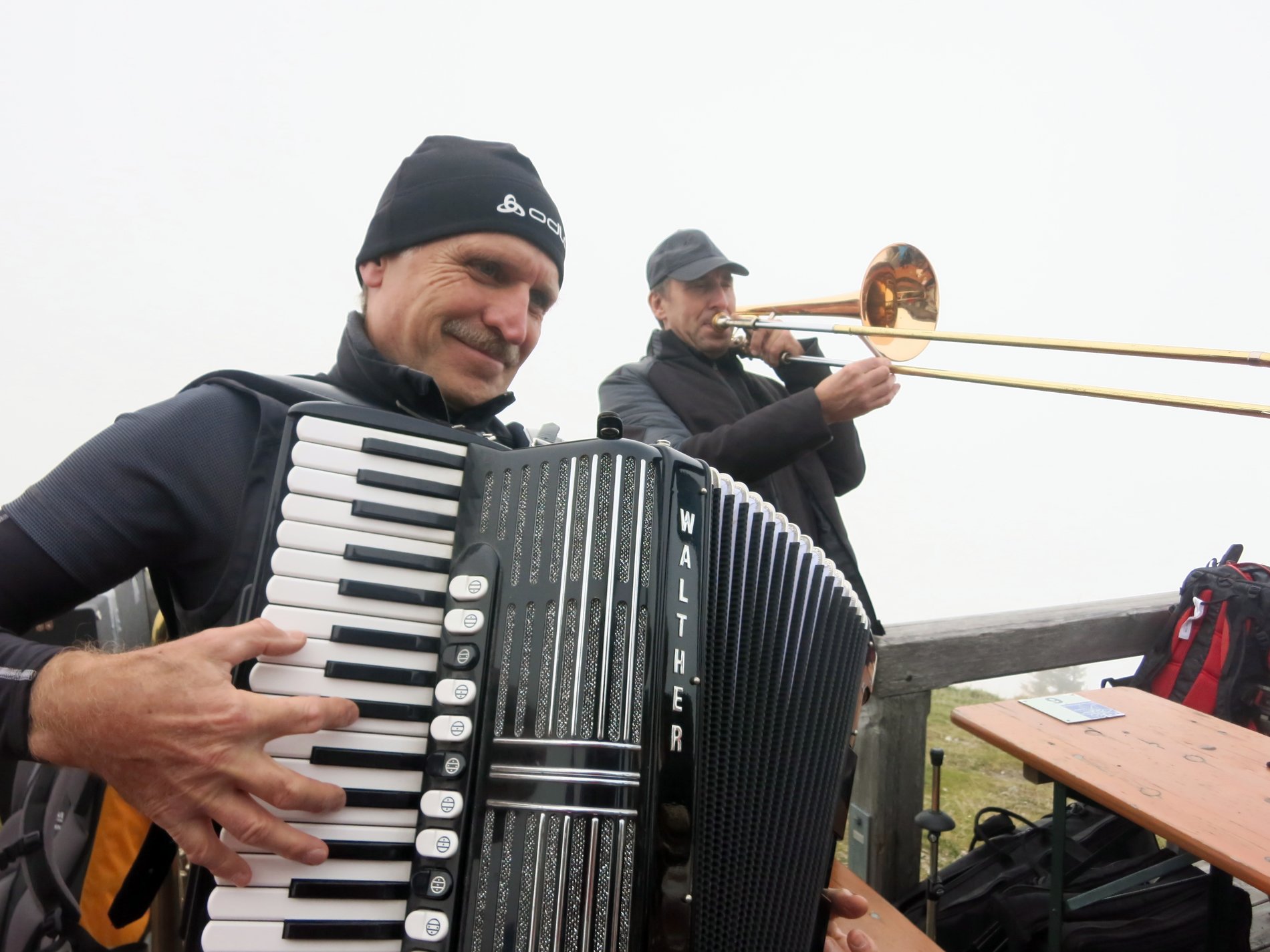 Mit „Brass nach Maß“ ein Sommerabschied nach Maß. Herzlichen Dank an Hans Gangkofer, der wie auch in den letzten Jahren die Musik organisierte. Trotz nebeligem Wetters machte sich eine größere Gruppe unter Leitung von Fritz Hager an den relativ langen Aufstieg von Aschau über Klausenberg und Predigtstuhl zur Hochries. Eine weitere Gruppe wählte den üblichen Anstieg vom Parkplatz Spatenau über die Seitenalm. Thomas Bruckmeier, mit acht Jahren der jüngste Teilnehmer, ließ es sich nicht nehmen, in Begleitung dreier Erwachsener die Auffahrt mit dem Fahrrad zu unternehmen. Alle Gruppen kamen pünktlich an und erlebten eine wunderschöne Abschlussfeier, bei der sogar die Wirtleute Elke und Florian Robl mitfeierten. Und natürlich auch die Christl Robl, die wir auf einem früheren Sommerabschied auf der Priener Hütte als Wirtin kennengelernt haben. Am nächsten Morgen zeigte das Wetter, dass wir zu Recht vom Sommer Abschied genommen haben. Es nieselte und war kalt. Ein paar Tage später war die Hochries von Schnee bedeckt.
