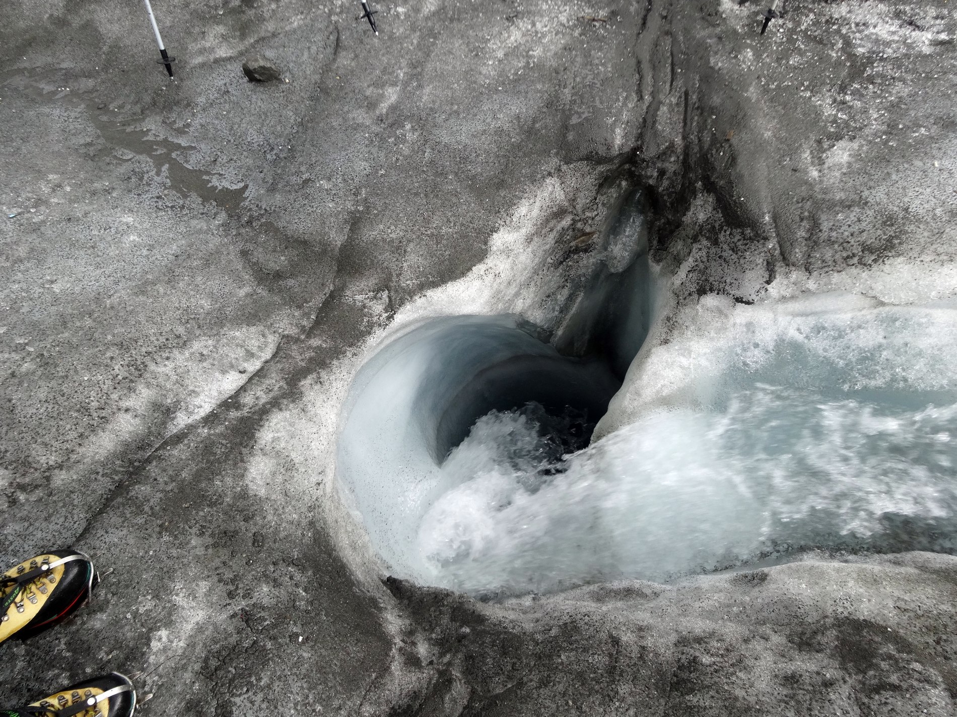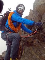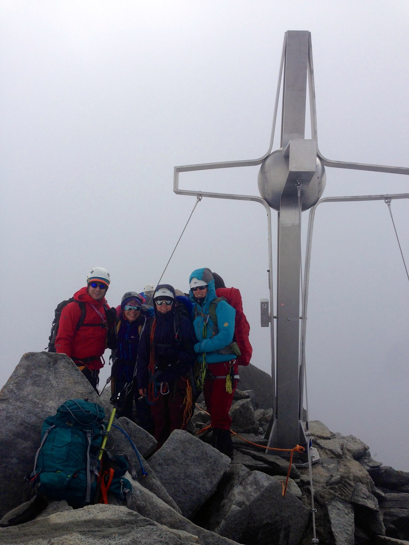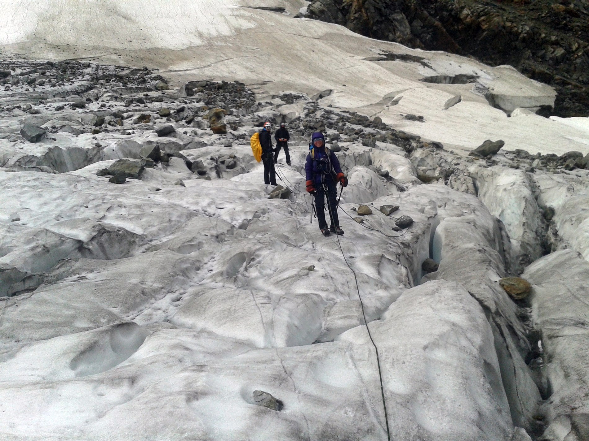 Am frühen Morgen stiegen wir mit unseren Stirnlampen zum Pfaffenferner auf und weiter an der Nordseite des Zuckerhütl vorbei in den Pfaffensattel. Während des Aufstiegs hatten wir immer wieder Gelegenheit, den richtigen Umgang mit Steigeisen und Pickel zu üben. Den folgenden Aufstieg und Abstieg zum Zuckerhütl (3 507 m) kletterten wir überwiegend am Fixseil. Unser Weg führte uns weiter auf den Wilden Pfaff (3 456 m) und über den Ostgrad hinunter zur Müllerhütte. Über den Wilden Pfaff musste durch den einsetzenden Schneeregen mit Fixseilen versichert werden.