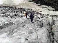 Am nächsten Morgen stiegen wir über die Lübecker Scharte zum Sulzenauferner ab. Durch die winterlichen Verhältnisse am Nordwestgrat konnten wir das Gehen und Klettern mit Steigeisen im Fels sehr gut üben. Der apere Gletscher eignete sich sehr gut für eine weitere Lehreinheit: Spaltenbergung.