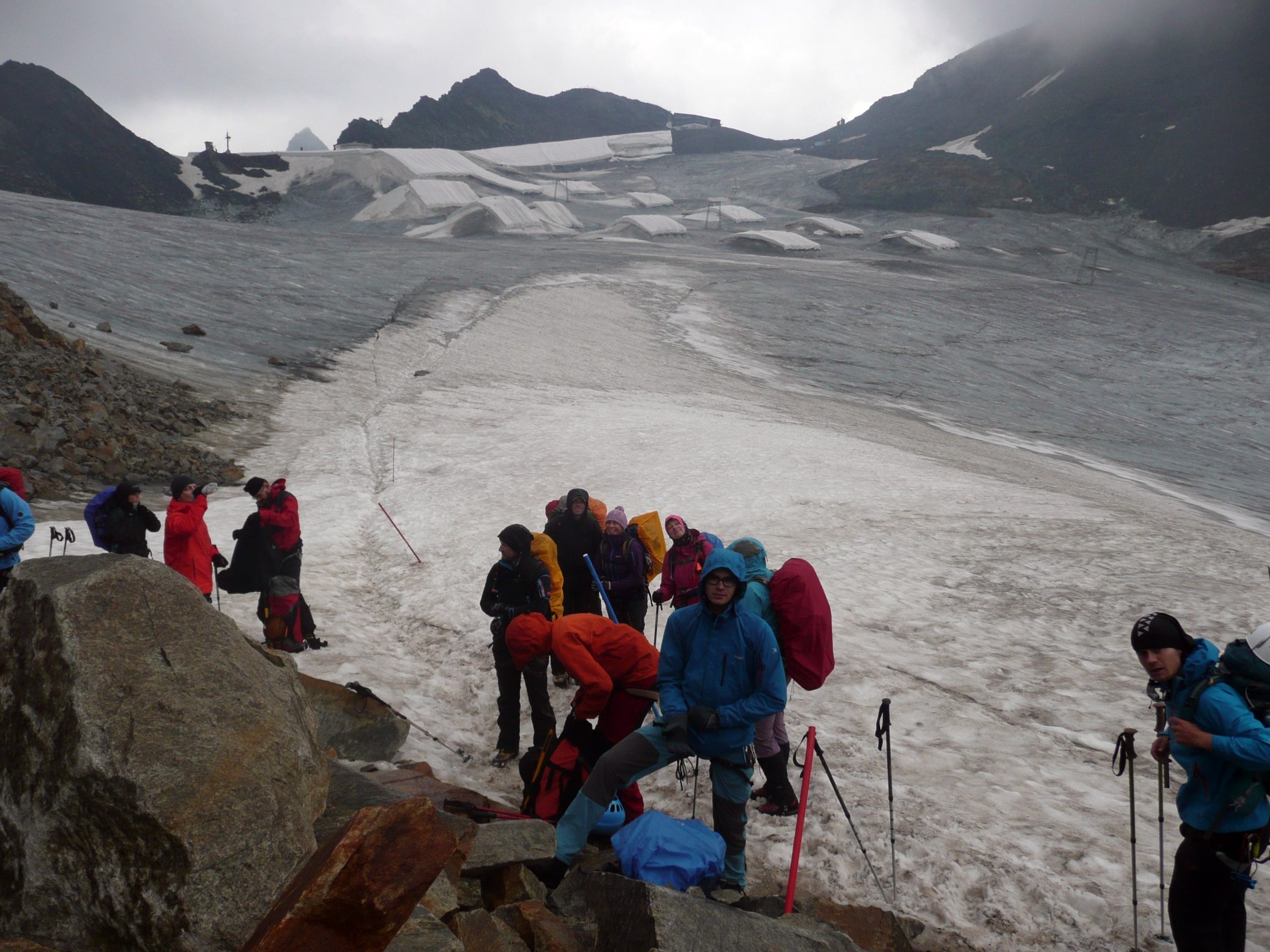 Mit Hilfe der Stubaier Gletscherbahn stiegen wir bei leichtem Regen zur Hildesheimer Hütte auf. Nach dem Abendessen trafen wir uns noch im Winterraum für eine kurze Lehreinheit zum Thema „Sicherungstechniken für größere Seilschaften im Fels“.
