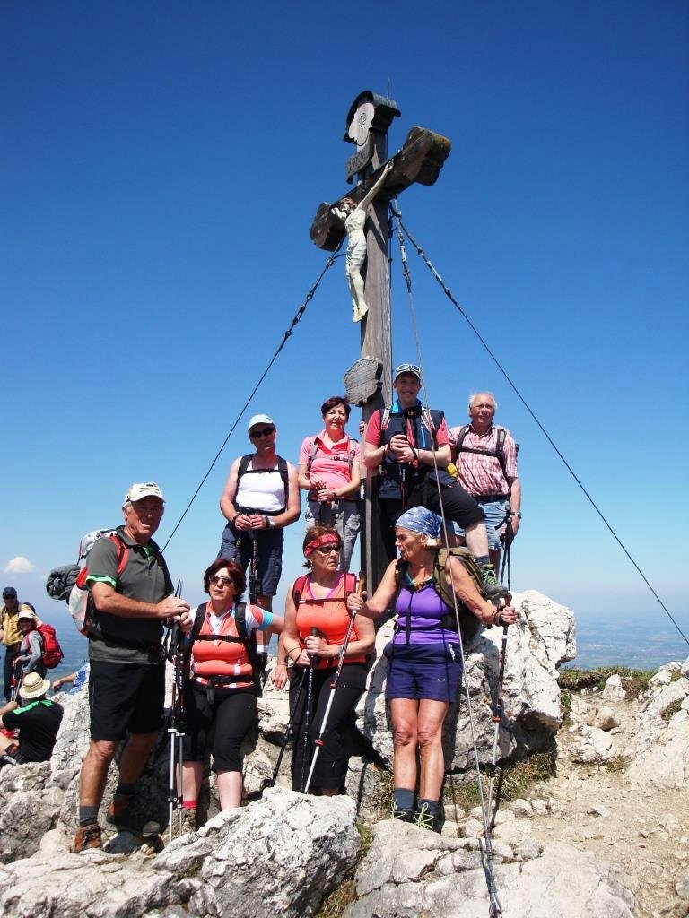 Bei wolkenlosem, tiefblauem Himmel ging die Fahrt zum Spitzingsee. Die Temperaturen lagen bei hochsommerlichen 32 Grad, so war der schattige Anstieg Richtung Firstalm angenehm. Aus dem Waldbereich raus über einen zum Teil seilversicherten Grat ging’s etwas schweißtreibend zum Gipfel. Bei der verdienten Gipfelbrotzeit kühlte eine kleine Brise. Die Aussicht am Gipfel war super. Der vorgesehene Rundkurs mit zwei Anstiegen von etwa 350 Hm wurde angesichts der hohen Temperatur und dem Durchschnittsalter von ca. 70 Lenzen auf Vorschlag des Tourenleiters verkürzt, so dass auf der oberen Firstalm die Einkehr auch zeitlich genossen werden konnte. Den Bus steuerte wie so oft souverän unser Fritz zurück nach Eggenfelden, vorbei an einem selten blauen Chiemsee und alle waren mit dem Tag zufrieden.