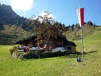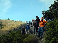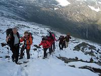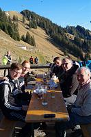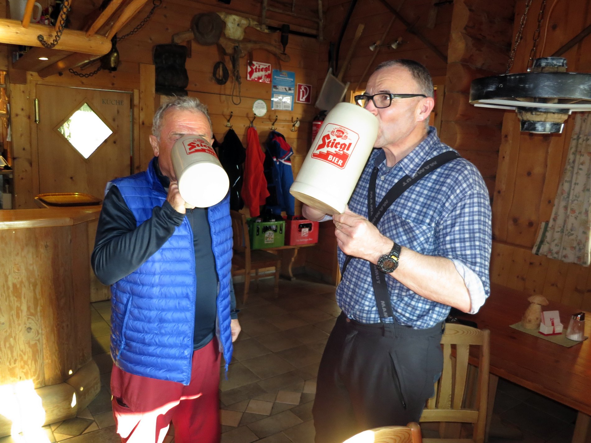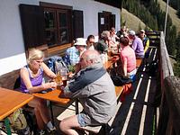 Und wieder hatte der Wetterbericht recht. Am dritten Tag war es deutlich kälter und die umliegenden Berge grüßten mit weißer Mütze. Auf dem Programm stand der 2 366 m hohe Stierkarkopf. Also führte uns der Weg wieder ins Riedigtal, dieses Mal allerdings mit dem Bus bis zur Hoislalm. Von dort stiegen wir vorbei an der Franz-Fischer-Hütte auf bis auf ca. 2 200 m. In dieser Höhe zwang uns die geschlossene Schneedecke zur Umkehr. Die Franz-Fischer-Hütte war ebenfalls geschlossen, bot aber im Eingangsbereich eine windgeschützte Unterstellmöglichkeit zur kurzen Brotzeit. Auf dem landschaftlich sehr reizvollen Höhenweg, vorbei an Essersee und Gruberkarhütte, in Richtung Jakoberalm erreichten wir dann die Schliereralm. Die Fahrer legten noch eine Sonderschicht ein, um die Fahrzeuge zu holen.