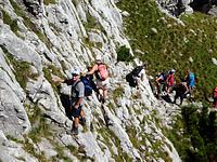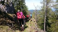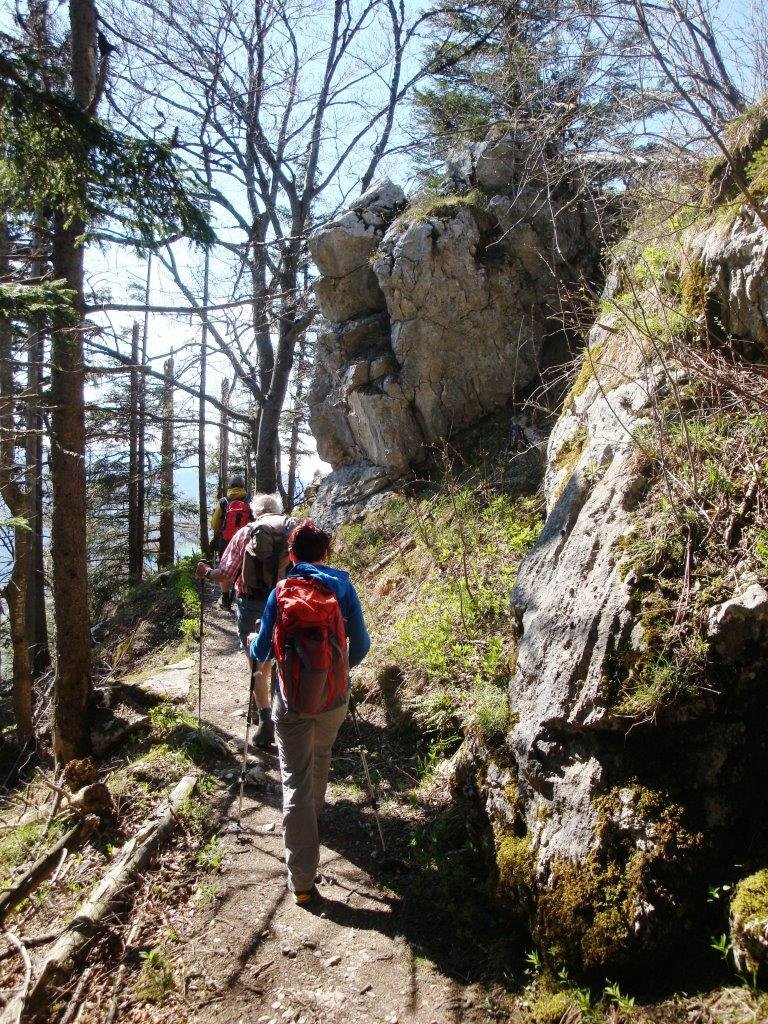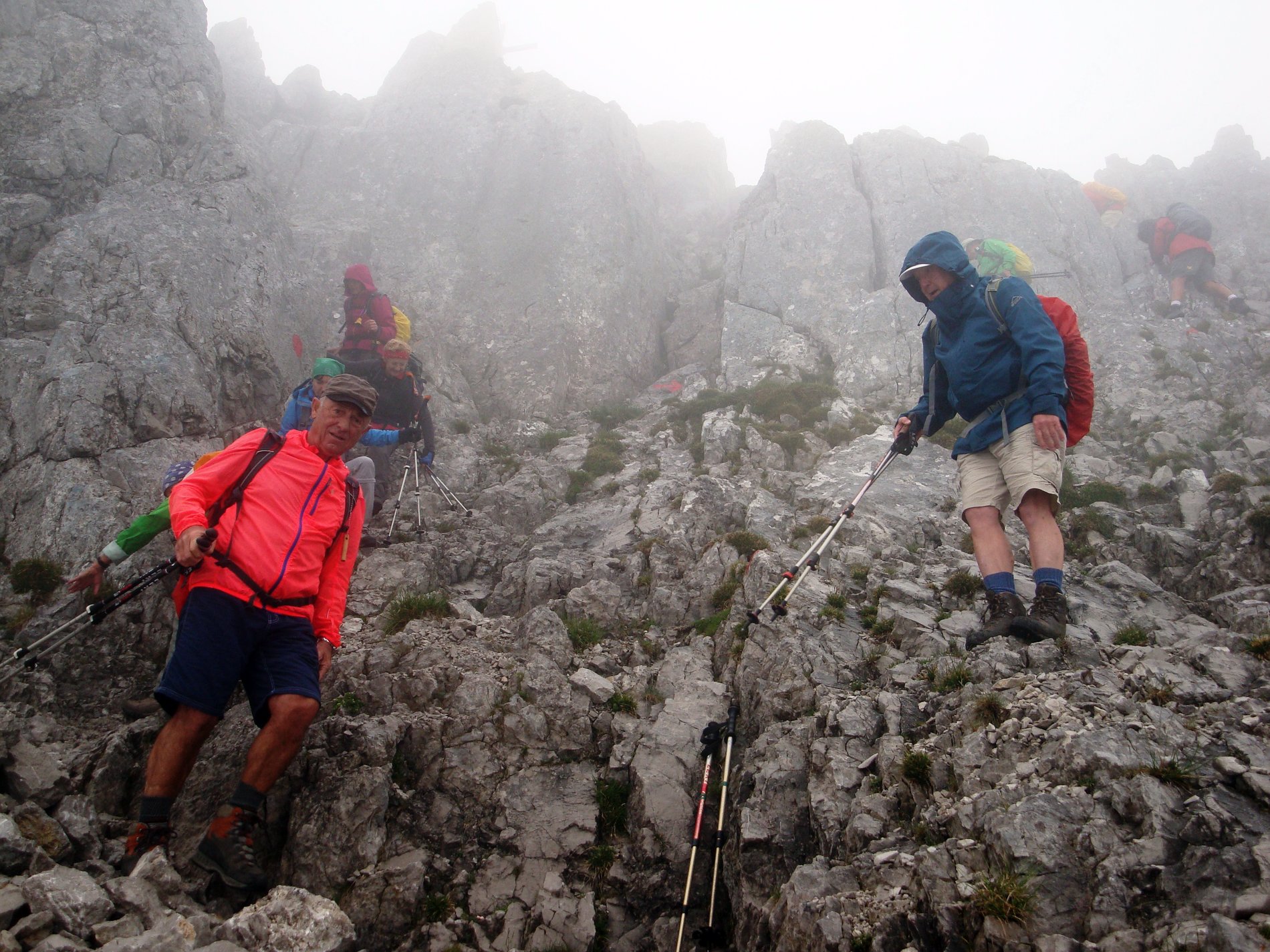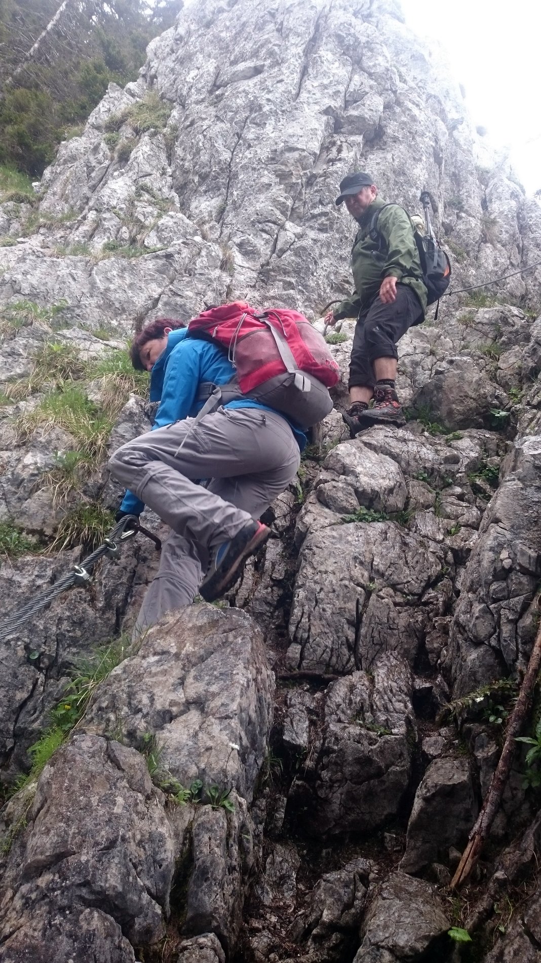 Der Schliffenbacher Franz kehrte an dieser Stelle um. Er ging nun zum Vereinsbus zurück, um nach Steyrling zu fahren. Das ist die andere Seite des Berges. Wir vier mussten nochmal ca. 100 Hm absteigen, um über einen mit Stahlseilen versicherten Steig zu unserem Gipfelziel zu gelangen.