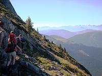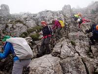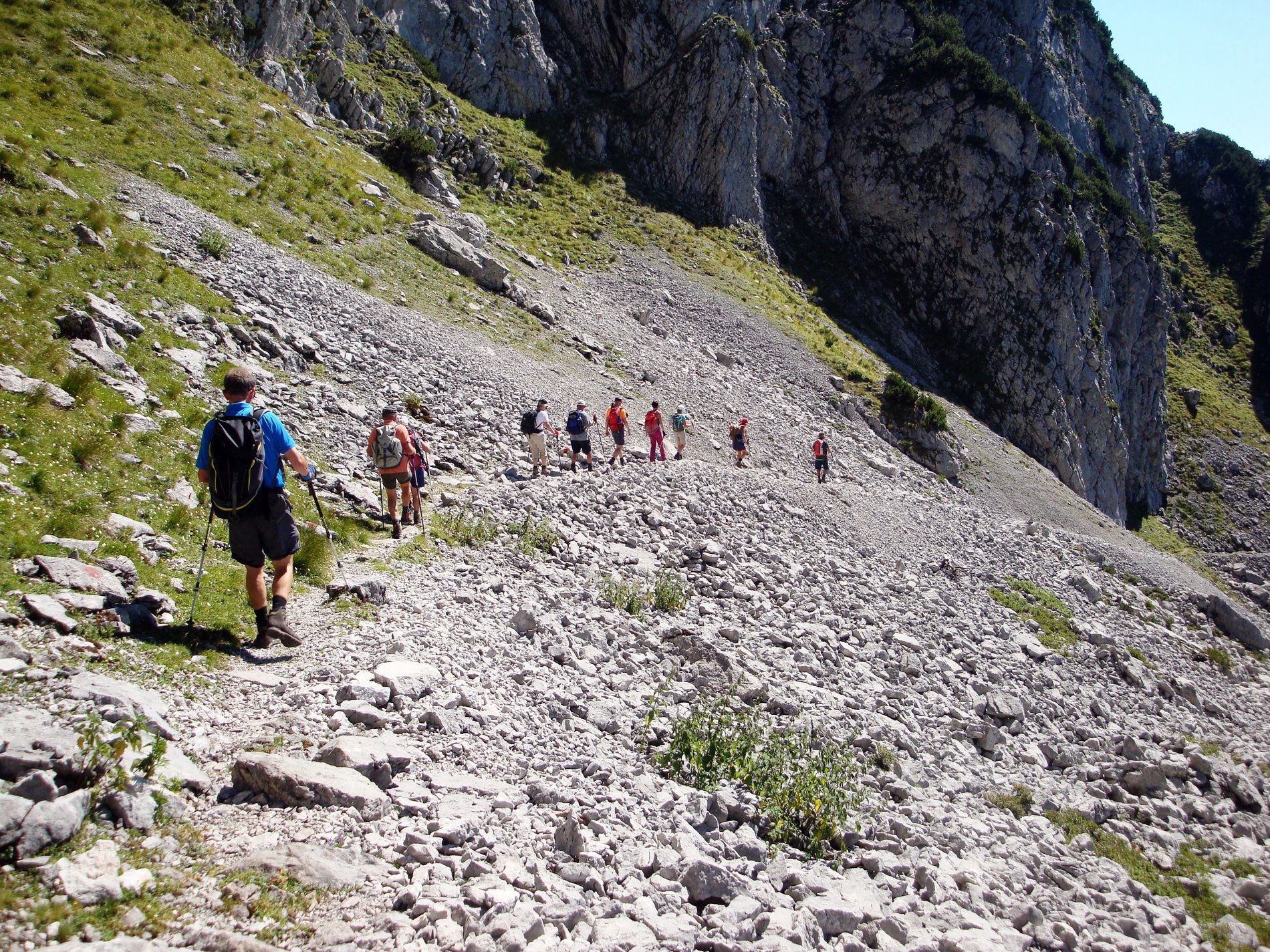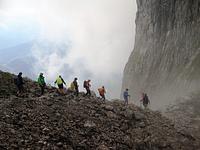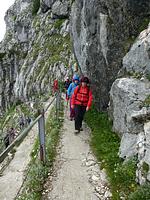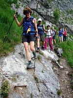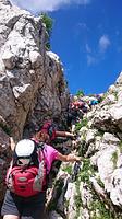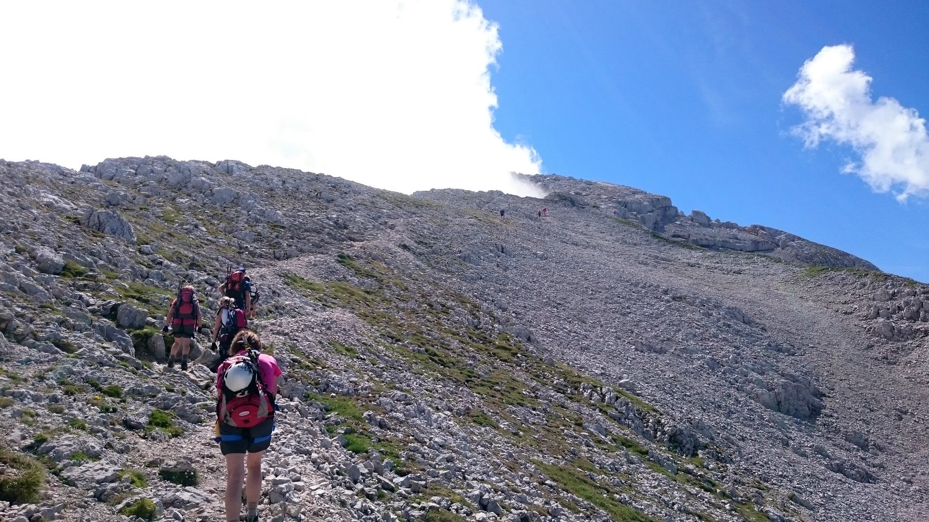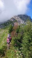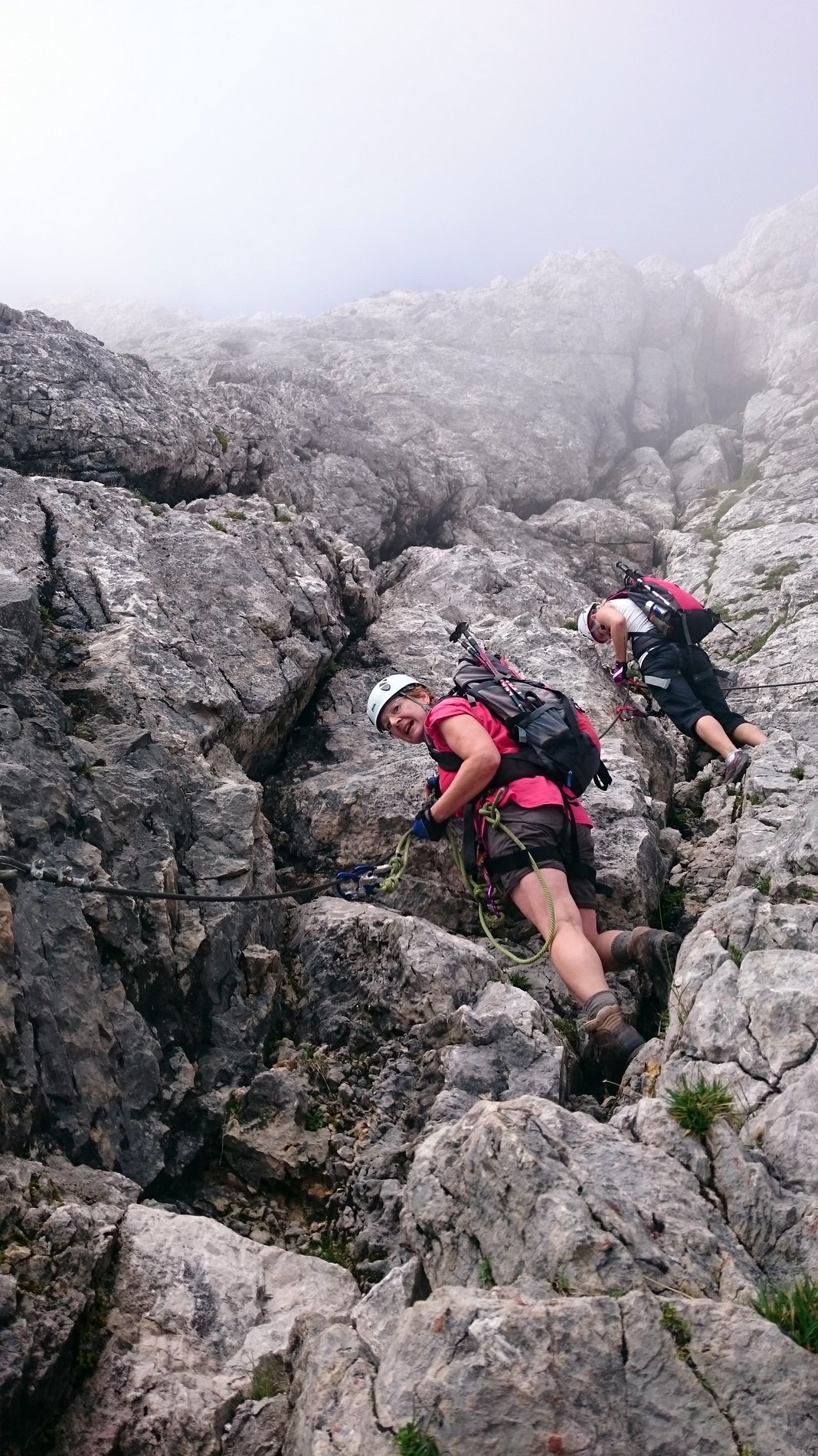 Der Schliffenbacher Franz kehrte an dieser Stelle um. Er ging nun zum Vereinsbus zurück, um nach Steyrling zu fahren. Das ist die andere Seite des Berges. Wir vier mussten nochmal ca. 100 Hm absteigen, um über einen mit Stahlseilen versicherten Steig zu unserem Gipfelziel zu gelangen.