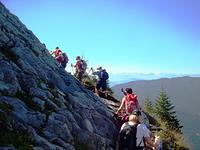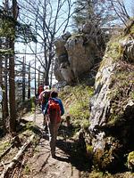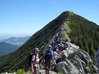 Bei bestem Bergwetter ging es am Parkplatz an der Staufen-Brücke los. Der Anstieg auf diesen Berg hat die meisten Teilnehmer überrascht. Der Fuderheustein ist ja nicht mal so hoch wie der Große Arber, aber es sind doch einige Passagen dabei, die den trittsicheren Berggeher erfordern. Nach etwa 600 Hm dachten die meisten, jetzt geht es über einen langen Kamm dem Gipfel entgegen. Denkste – denn es ging nochmal ganz schön bergauf und die letzten Höhenmeter zum Gipfel waren sogar noch mit einem Drahtseil gesichert.