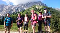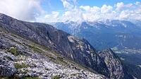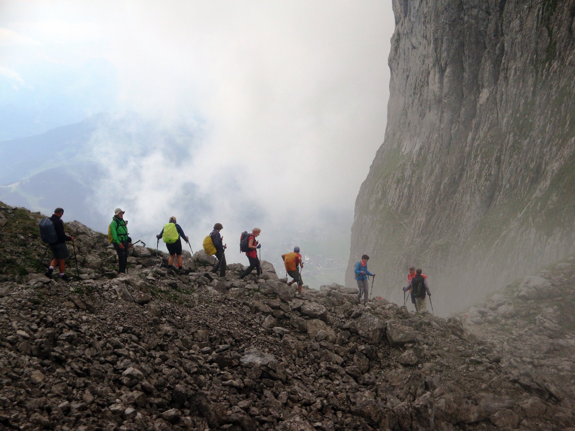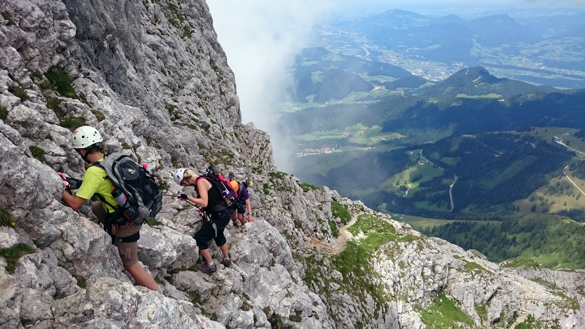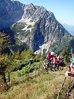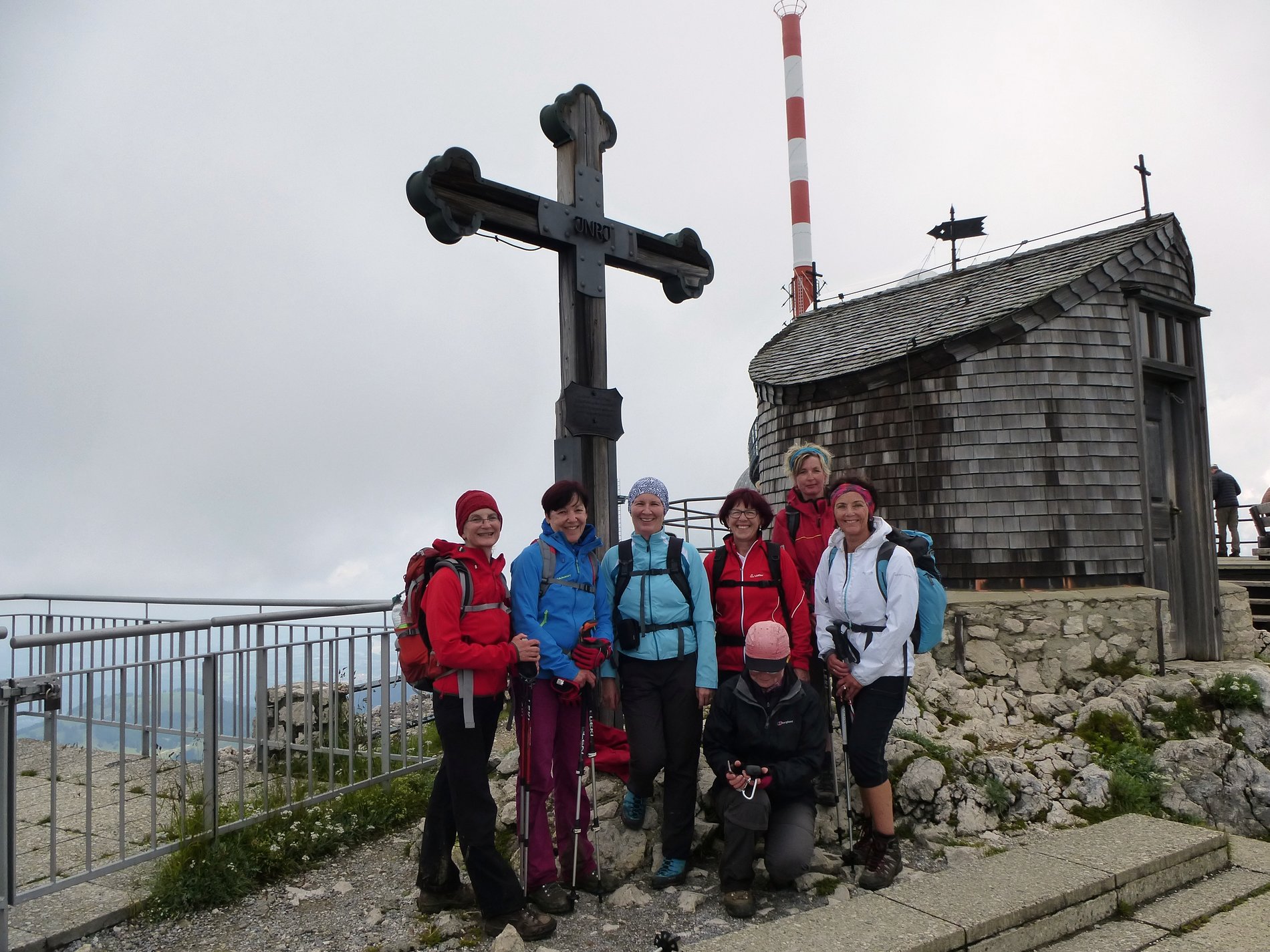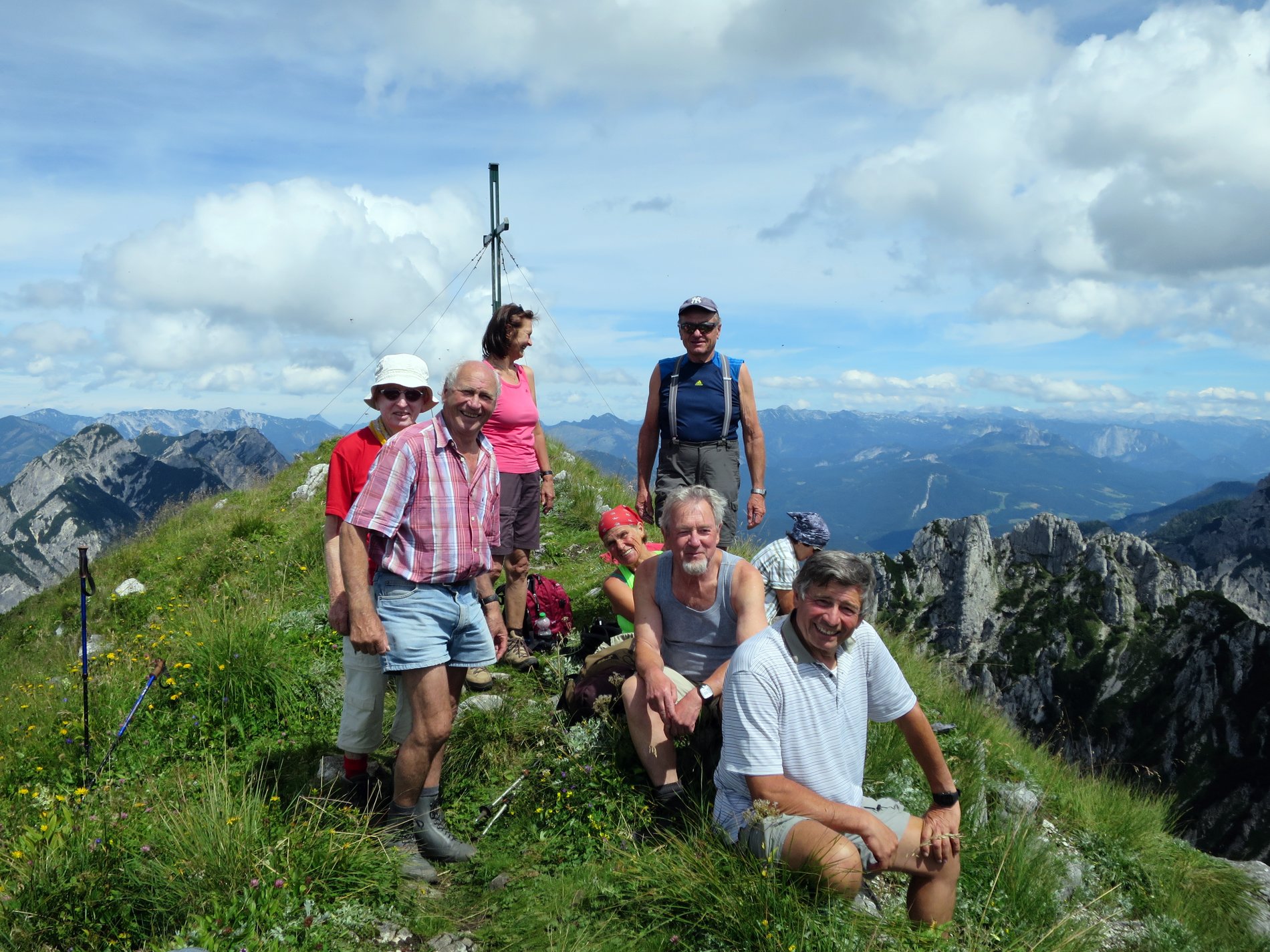 Die starke Gewitterneigung erforderte die Verlegung der Tour. Eine Woche später wurden wir dann aber mit bestem Bergwetter belohnt. Von der Roßfeldstraße in der Nähe vom Ahornkaser starteten wir. Zuerst ging es etwas bergab, um dann über eine sehr lange Holztreppe zum Purtschellerhaus aufzusteigen. Den Wanderweg entlang erreichten wir über längere, aber leichte Kletterstellen den eigentlichen Kamm. Wir wählten den Schustersteig und erreichten gut gesichert an Stahlseilen die Göllleiten. Auf dem breiten Rücken immer an der Gratkante ging der Weg weiter zum Gipfel des Höhen Gölls.