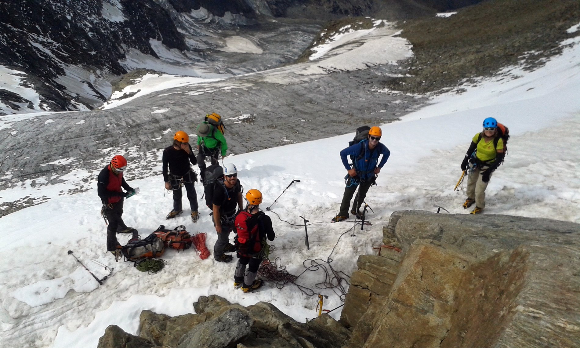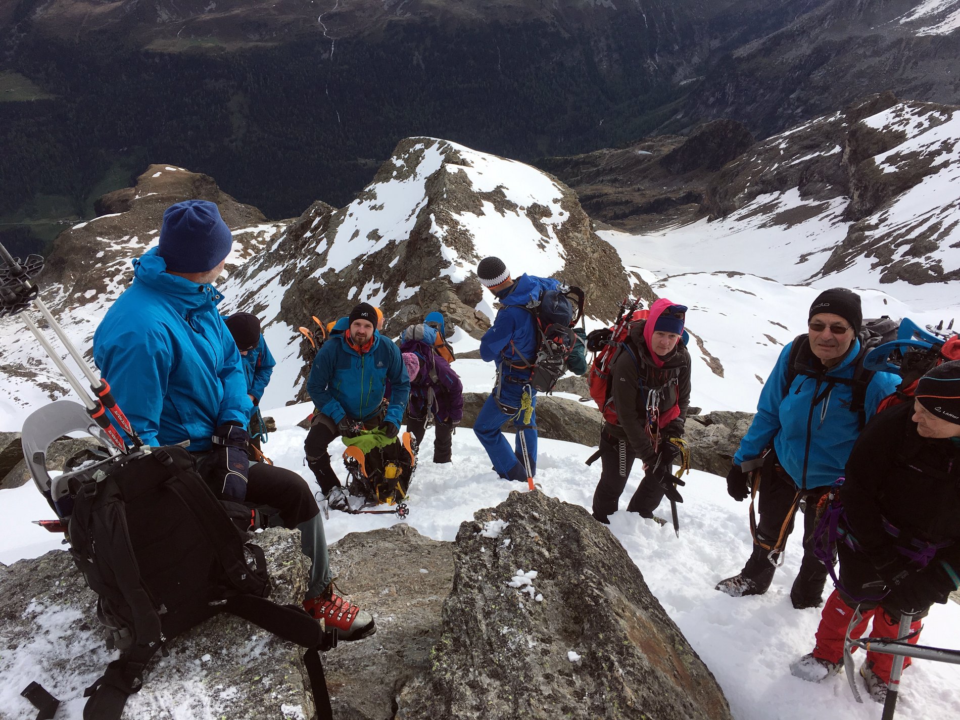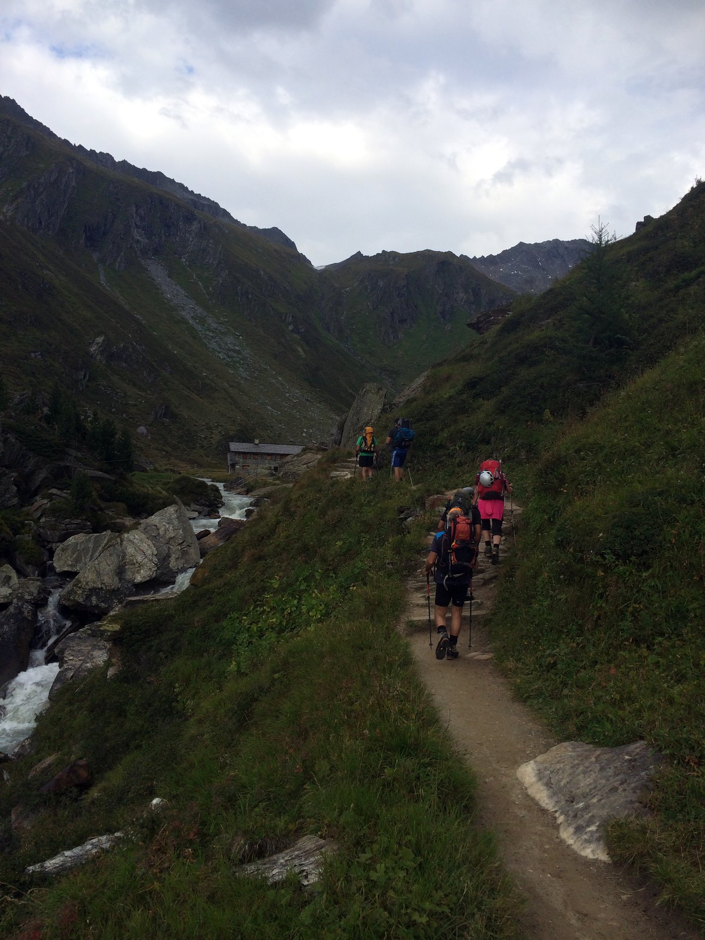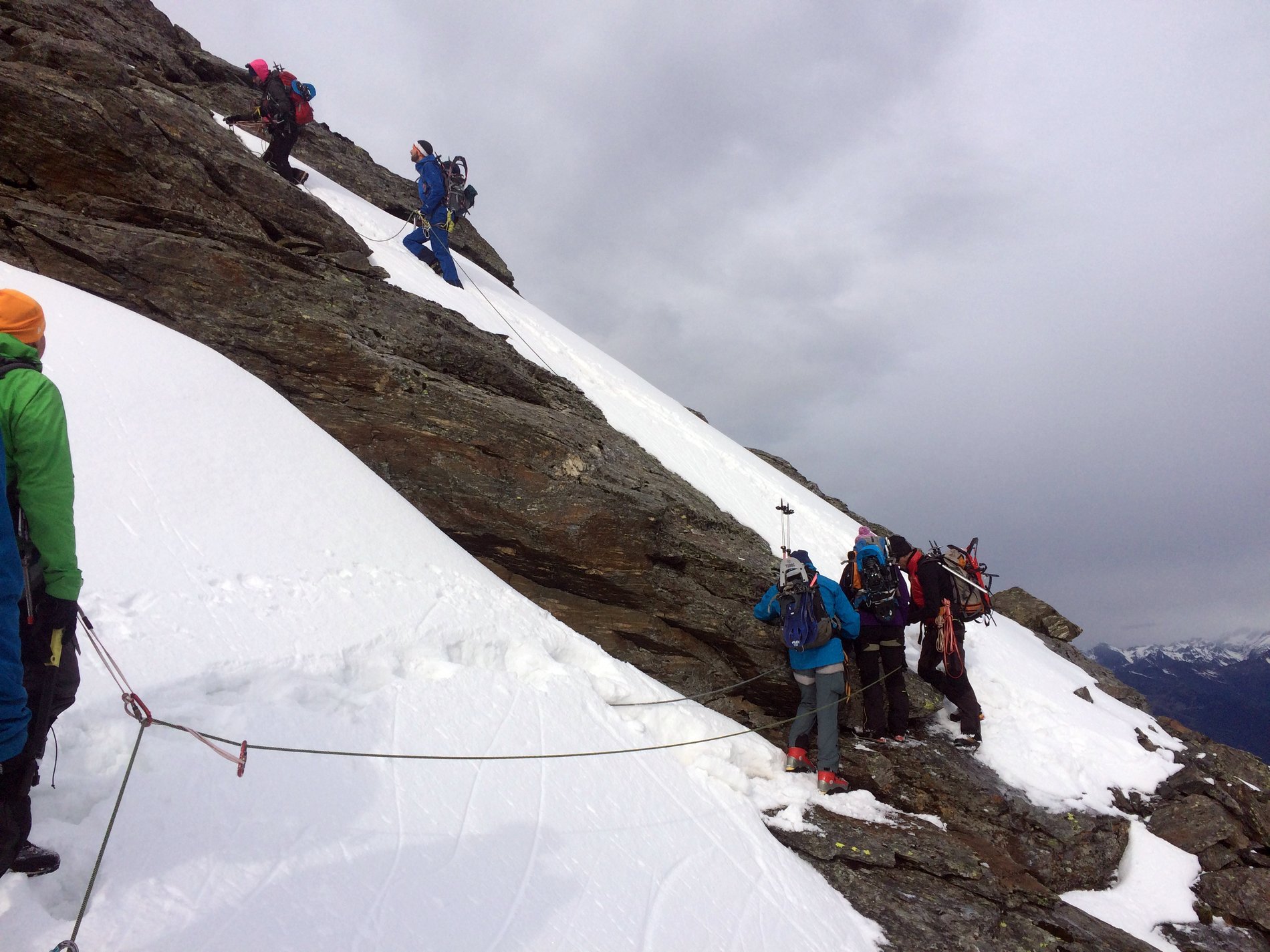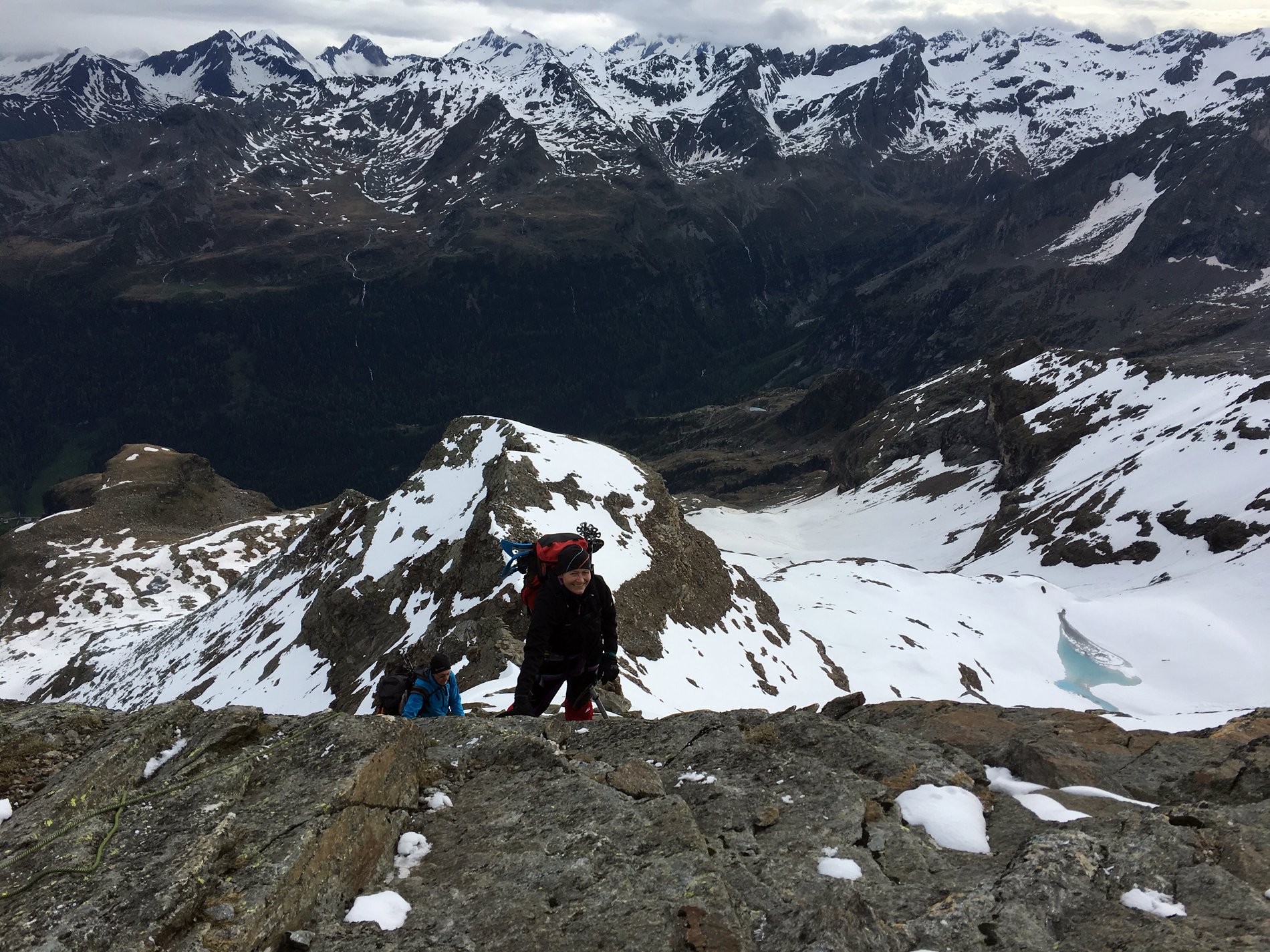 Ausgehend vom Ahrntal begannen wir unsere Hochtourenrunde in der Venedigergruppe. Über die Birnlückenhütte, wo wir unsere erste Nacht verbrachten, stiegen wir zur Dreiherrenspitze (3 499 m) auf. Beim Aufstieg konnte wir verschiedene hochtourenspezifische Ausbildungsinhalte, wie das Gehen am Fix- und Geländerseil und Pickel- und Steigeisentechniken, einbauen. Vom Gipfel führte uns ein langwieriger Abstieg entlang der Österreich-Italien-Grenze runter zur Lenkjöchlhütte, wo wir unsere zweite Hüttennacht verbrachten. Am frühen Morgen stiegen wir zur unteren Rötspitze, dem Beginn des Gipfelgrades, auf und weiter über diesen zur Rötspitze (3 496 m). Bevor wir ins Tal abstiegen, stärkten wir uns noch einmal in der Lenkjöchlhütte.