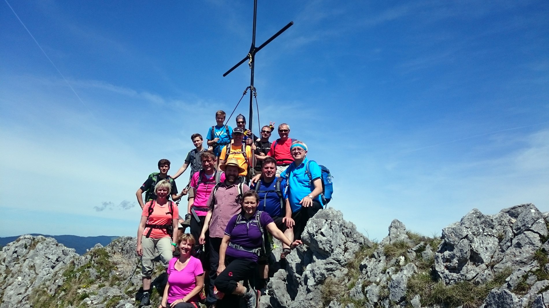 Es regnete am Gipfel leicht, aber wir vier Gipfelaspiranten waren erfreut über unseren Gipfelsieg. Der Abstieg über den stahlseilversicherten Steig gestaltete sich etwas happig, da es an den felsigen Stellen etwas schmierig und rutschig war. Am Ende unseres Abstieges ging es dann über Forststraßen nach Steyrling, wo wir im Gasthof „Kaiserin Elisabeth“ einkehrten.