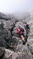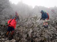 Wären wir eine Stunde länger im Bett geblieben, hätte uns der einzige Regenschauer am Anfang nicht gleich in die Gaudeamushütte getrieben. Daß der südliche Aufstieg zum Elmauer Tor nicht so schweißtreibend wurde, verdankten wir den ständig durchziehenden Wolken. Der Gipfelaufbau verlangte noch etwas Schwindelfreiheit und Trittsicherheit. Tiefblicke in die steinerne Rinne und auf bekannte Kaisergipfel im Abstieg sowie dann Sonne auf der Terrasse der Gaudeamushütte entschädigten für den Schauer am Morgen.