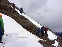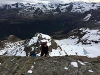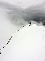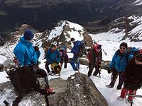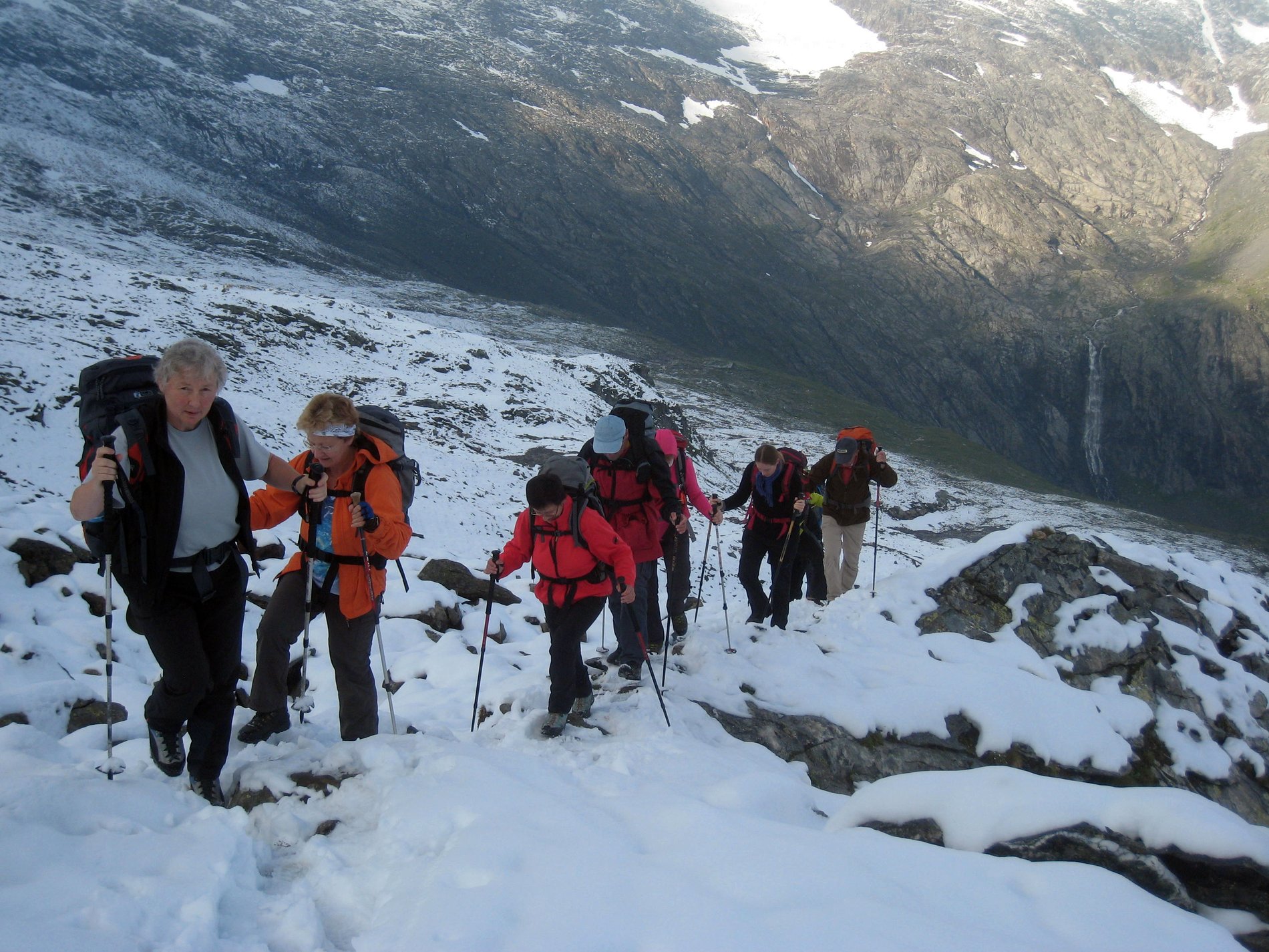 Kalt war es am nächsten Morgen und ab ca. 2 600 m erwartete uns eine geschlossene Schneedecke. Auf einer guten Spur erreichten wir die Larmkogelscharte und die letzten Meter zum Gipfel waren zum Teil noch mit einem Fixseil gesichert. Leider blieb uns das gewaltige Larmkogelpanorama verwehrt. Auch auf unserem Abstieg zur Neuen Fürther Hütte lag im oberen Bereich Schnee. Zwei fremde Bergkameraden waren uns sehr behilflich. Sie fuhren Richard zu unserem Ausgangspunkt ins Habachtal, schließlich lag dort der Schlüssel zum Bus, den wir ja vorsorglich am Vortag schon am Ziel unserer Tour geparkt hatten. Leider blieb der Schlüssel aber im Auto im Tal liegen. Der Rest der Truppe machte auf der Neuen Fürther Hütte noch kurz Rast und stieg zum Materialaufzug ab. Nach bereits 1 321 m im Abstieg waren wir froh, die restlichen Kilometer im Auf und Ab mit dem Hüttentaxi zu bewältigen. Einig waren sich alle, dass es eine schöne, wenn auch lange und anstrengende Tour war.