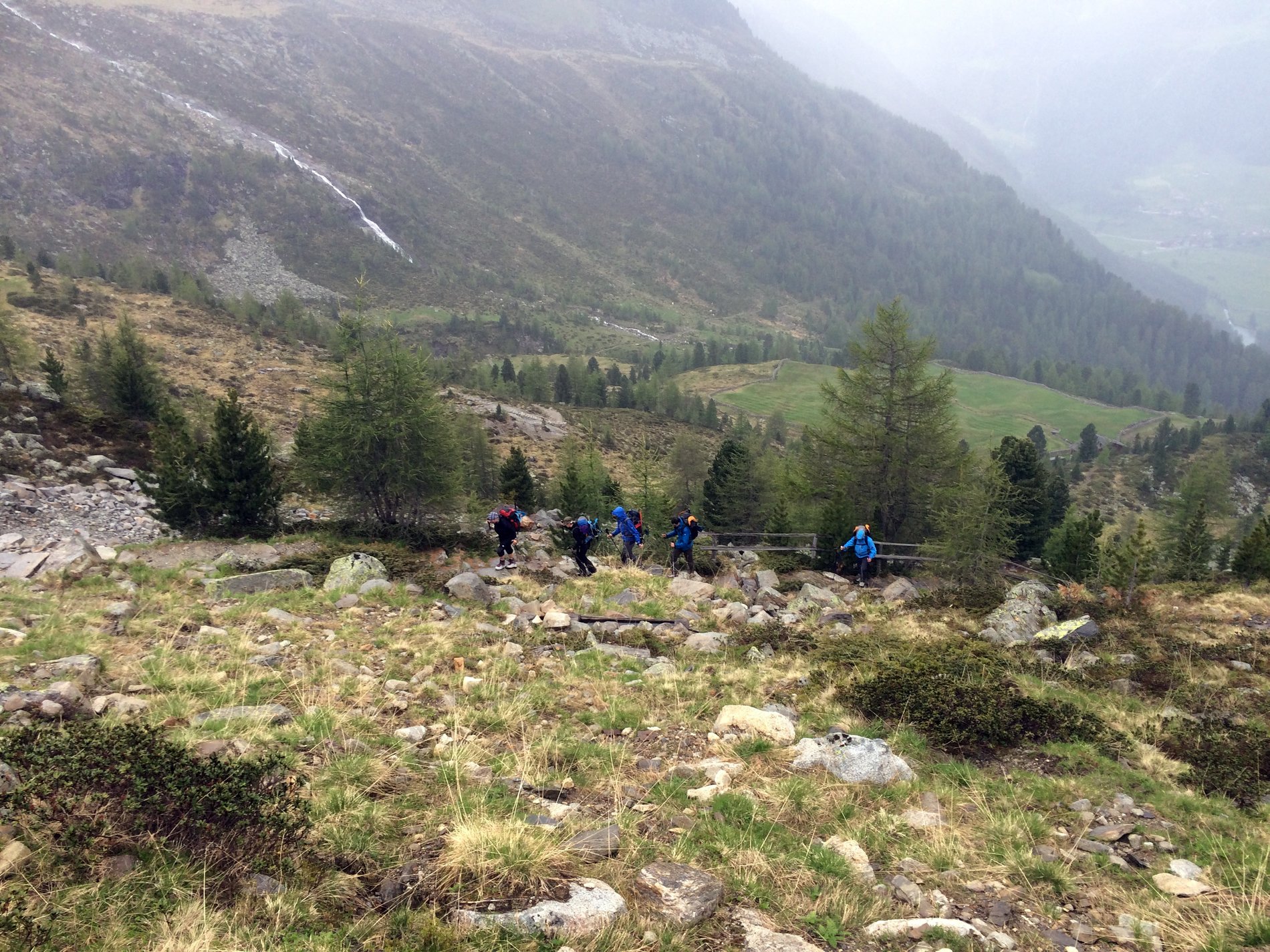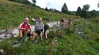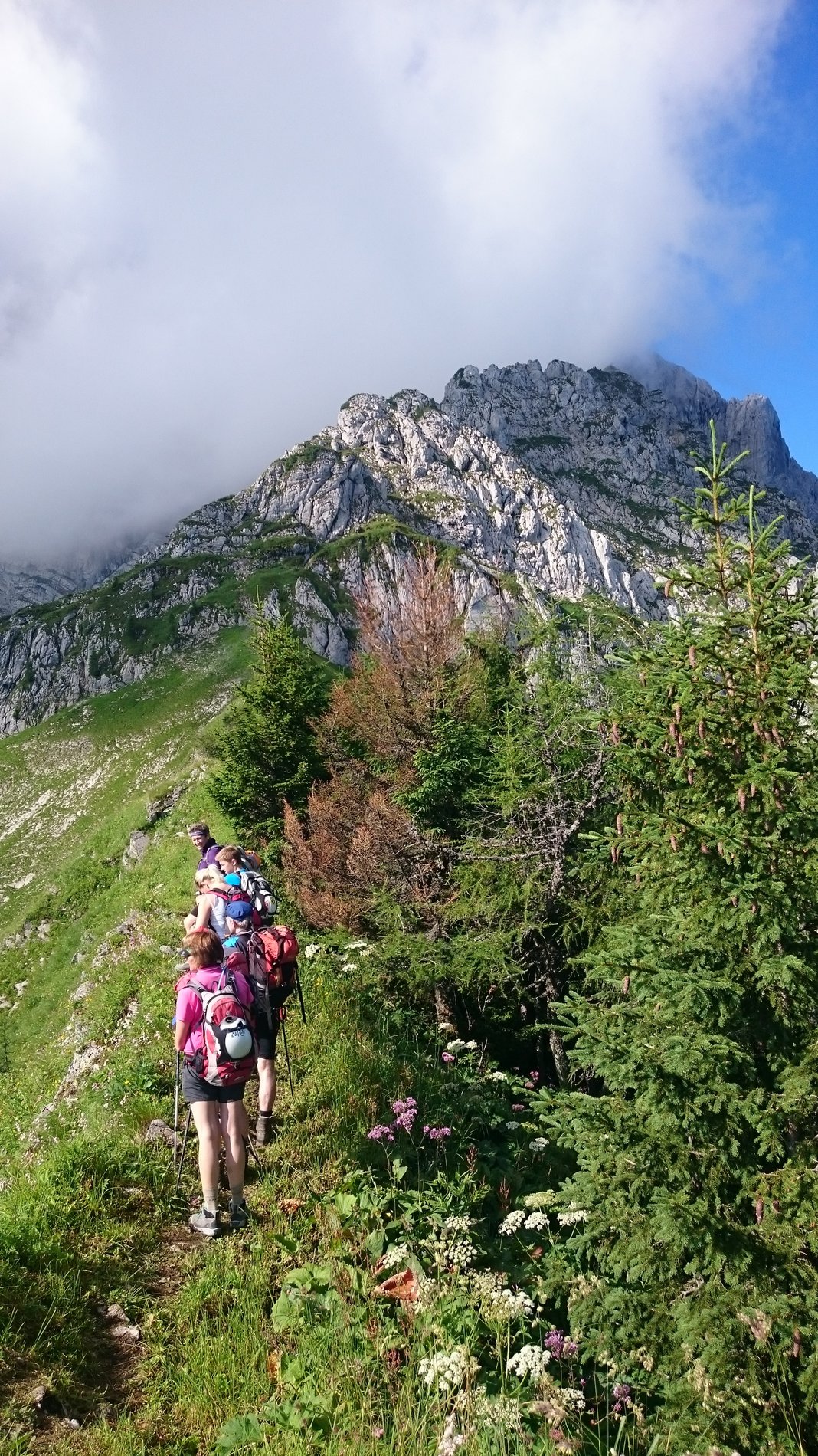 Leider stimmte der Wetterbericht für den zweiten Tag. Bei leichtem Nieselregen, aber mit viel guter Laune im Rucksack, gingen wir gut beschirmt entlang des Riedigbaches bis zur Königalm. Zurück auf gleichem Weg erwischte uns während der letzten halben Stunde noch ein ordentlicher Regenguss und alle waren froh, dass wir in einem Talquartier mit heißer Dusche untergebracht waren.