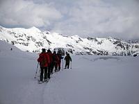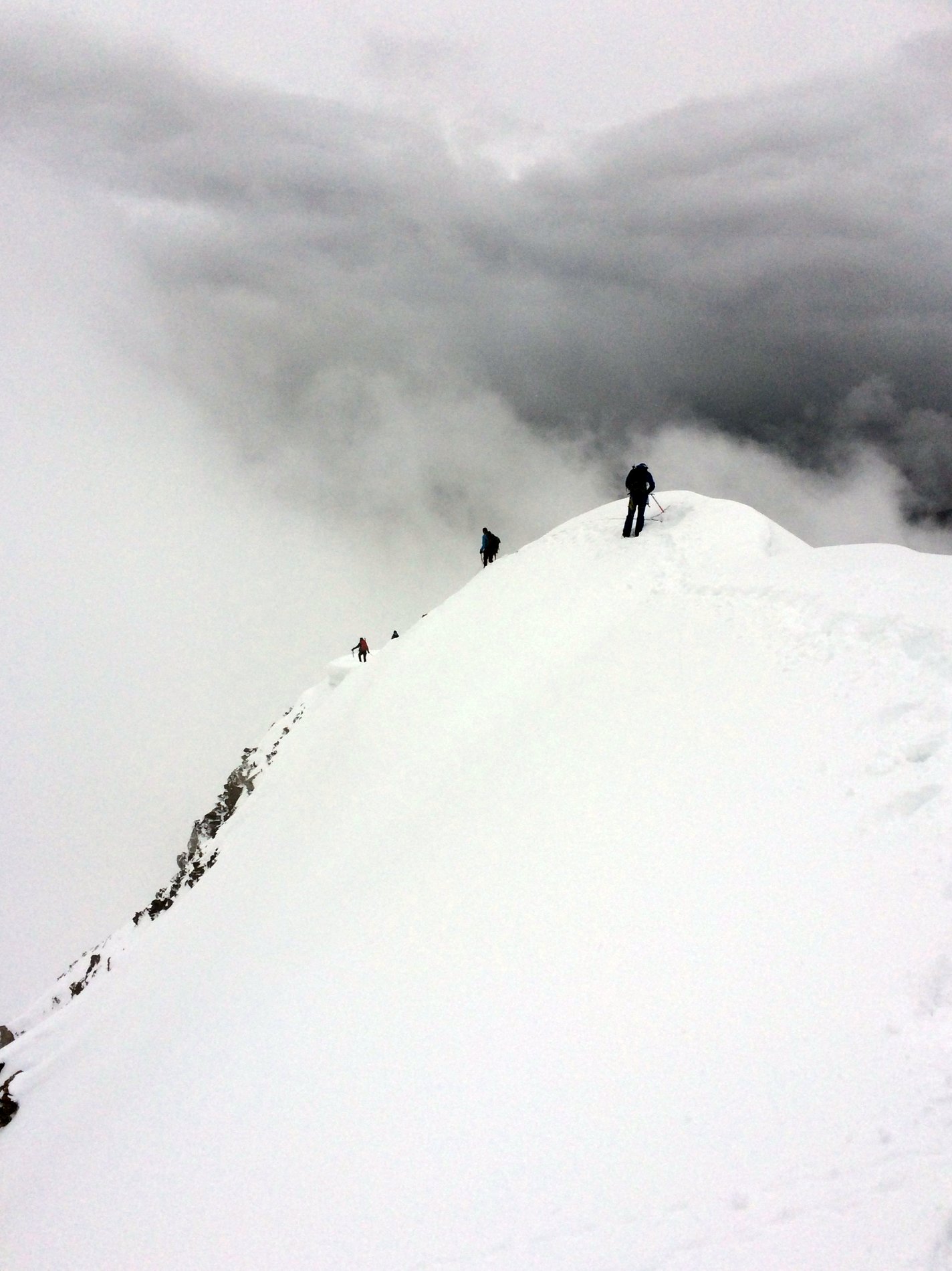 Am frühen Samstag fuhren wir über den Brenner nach Rain in Taufers und stiegen zur Kasseler Hütte, unserem Ausgangspunkt für unsere Gipfelbesteigung, auf. Aufgrund des schneereichen Spätwinters hatten wir auf dieser Tour unsere Schneeschuhe mit im Gepäck. Nach einer kurzen Nacht stiegen wir erst zu Fuß und dann mit unseren Schneeschuhen Richtung Schneebiger-Nock-Ferner auf. Über einen langen Gipfelgrat, den wir mit Fixseilen versicherten, erreichten wir den Gipfel des Schneebigen Nock (3 358 m). Am Abstieg machten wir noch einmal Halt an der Kasseler Hütte, um uns für die Heimreise zu stärken.