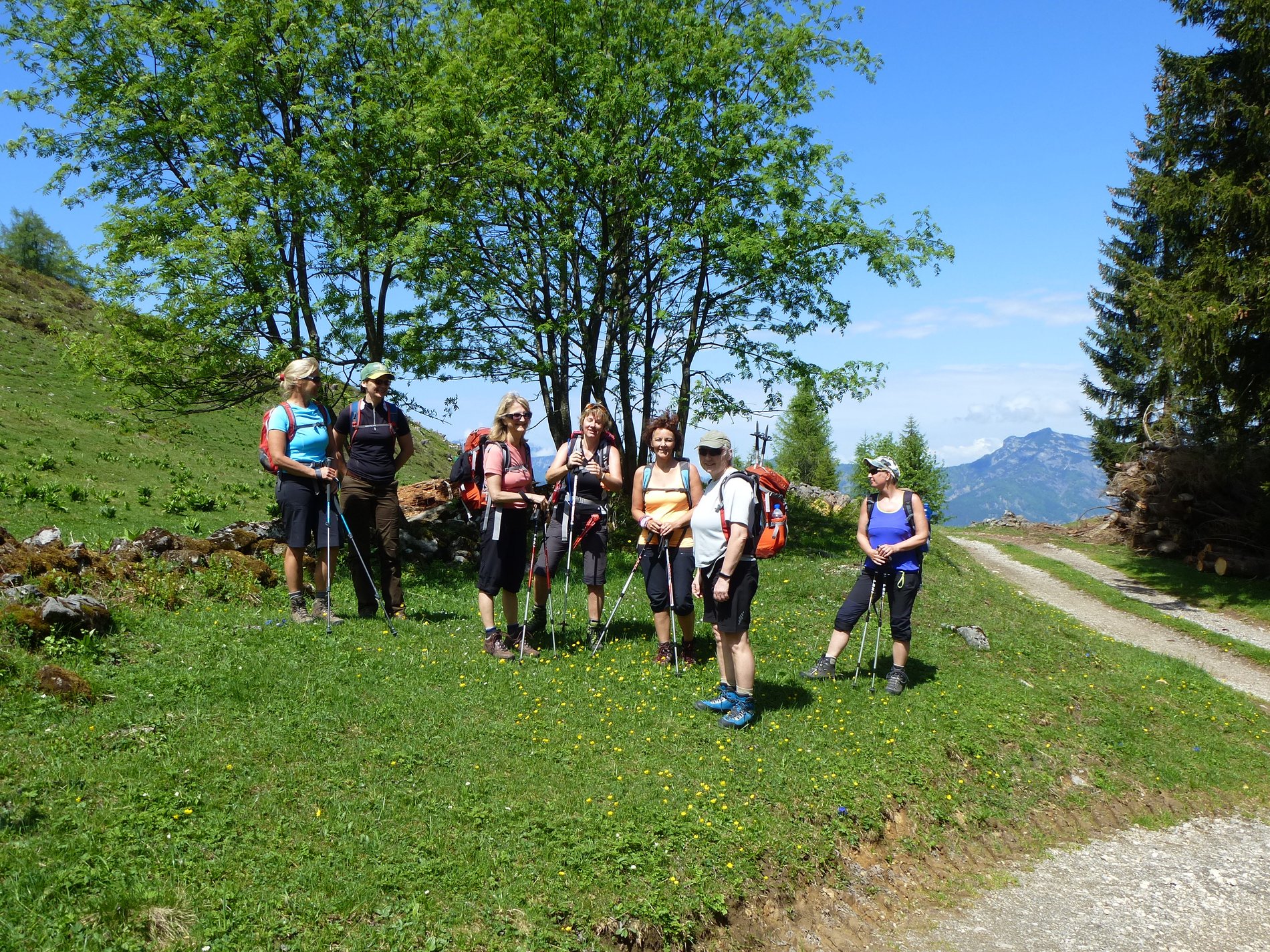 Start unserer ersten Frauentour in diesem Jahr war der Gasthof Oberweißbach zwischen Waidring und Pillersee. Nach einer etwas verregneten Anfahrt waren unsere Sorgen bezüglich eines schönen Bergwetters sofort verschwunden, denn wir wurden von herrlichem Sonnenschein an unserem Parkplatz empfangen. Erst etwas flach durch Wald und dann auf einer Forststraße führte uns der Weg an der Raineralm vorbei bis zur Hochbreitaualm. Von dort stiegen wir über Wiesenpfad und durch Latschengewächs zu unserem ersten Gipfelziel, dem Kirchberg, in gut 2½ Stunden auf. Eine herrliche Rundumsicht von den Loferer über die Leoganger Berge, das Kitzbühler Horn, den Wilden Kaiser, die ganze Reihe der Chiemgauer Alpen bis hin zur Steinplatte in voller Breite umrahmte unsere ausgiebige Gipfelrast. Ein unschwieriger Übergang zum Schafelberg, der einigen noch von einer vergangenen Schneeschuhtour in Erinnerung ist, bei der Reinhard hüfttief spuren durfte, führte uns zu unserem zweiten Gipfel. Durch frühlingshaft grüne Landschaft, vorbei an zahlreichen Blumenwiesen, beendeten wir unsere Rundtour mit einer gemütlichen Einkehr im Gasthof Oberweißbach.