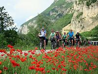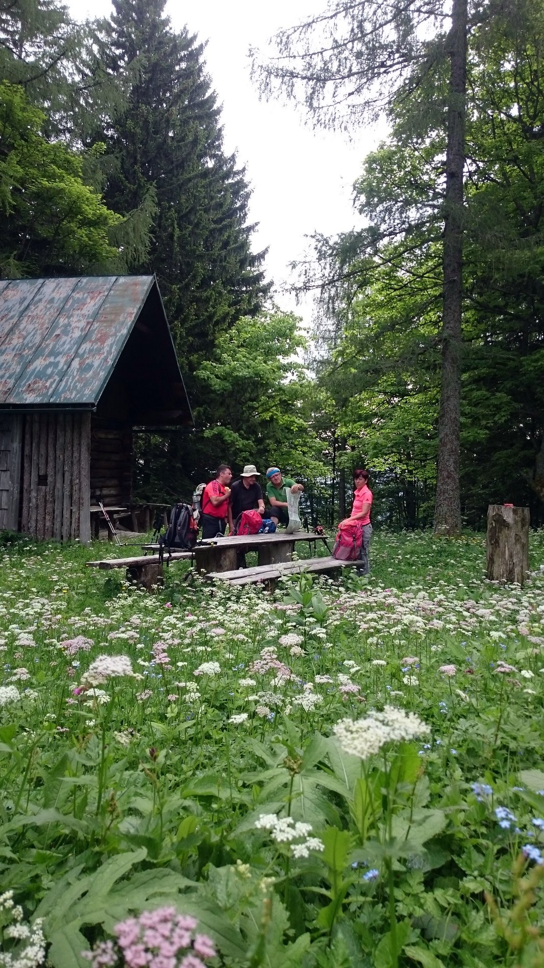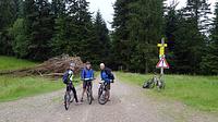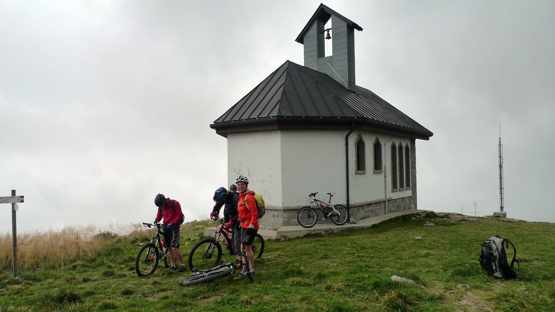 Am nächsten Tag starteten wir von unserem Talquartier in Kobarid zur Tour auf den 1 645 m hohen Matajur – alle mit Regenjacken. Bis kurz unter den Gipfel kann man auf den in den Weltkriegen angelegten Schotterstraßen fahren, nie zu steil, aber manchmal recht grob und holprig. Nach knapp 1 600 Hm Anstieg war die Gipfelbrotzeit redlich verdient. Der angekündigte, pünktlich beginnende Regen vertrieb uns dann aber doch recht schnell und zurück ins trockene Quartier stand uns auch noch eine steile und schwierige Abfahrt mit ein paar Schiebestrecken bevor. Völlig durchnäßt und nicht ganz ohne Blessuren kamen wir dort schließlich an.