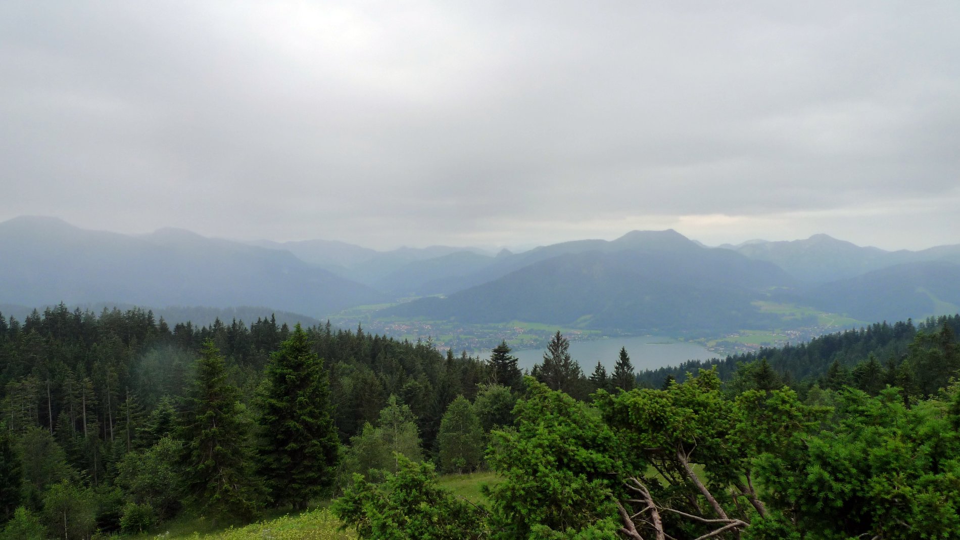 Bestellt war schönes Wetter, hat aber nicht geholfen. Auf der langen, aber nicht übermäßig steilen Auffahrt über die Gindelalm zur Neureuther Hütte war’s noch trocken. Aber kaum haben wir uns für eine Tasse Kaffee oder eine Suppe auf die Terrasse gesetzt, hat’s zugezogen und zu nießeln angefangen. Es gibt Schlimmeres – aber auch Lustigeres, als auf einer schmierigen und holprigen Steinpiste ins Tal zu fahren. Der Weg zurück vom Tegernsee hat gemütlich mit der Auffahrt zum Kreuzbergsattel begonnen. Dort entschieden wir uns für die direkte Abfahrt auf einem schmalen und durchaus anspruchsvollen Waldpfad in Richtung Schliersee, wo wir dann a bißerl eing’saut angekommen sind.
