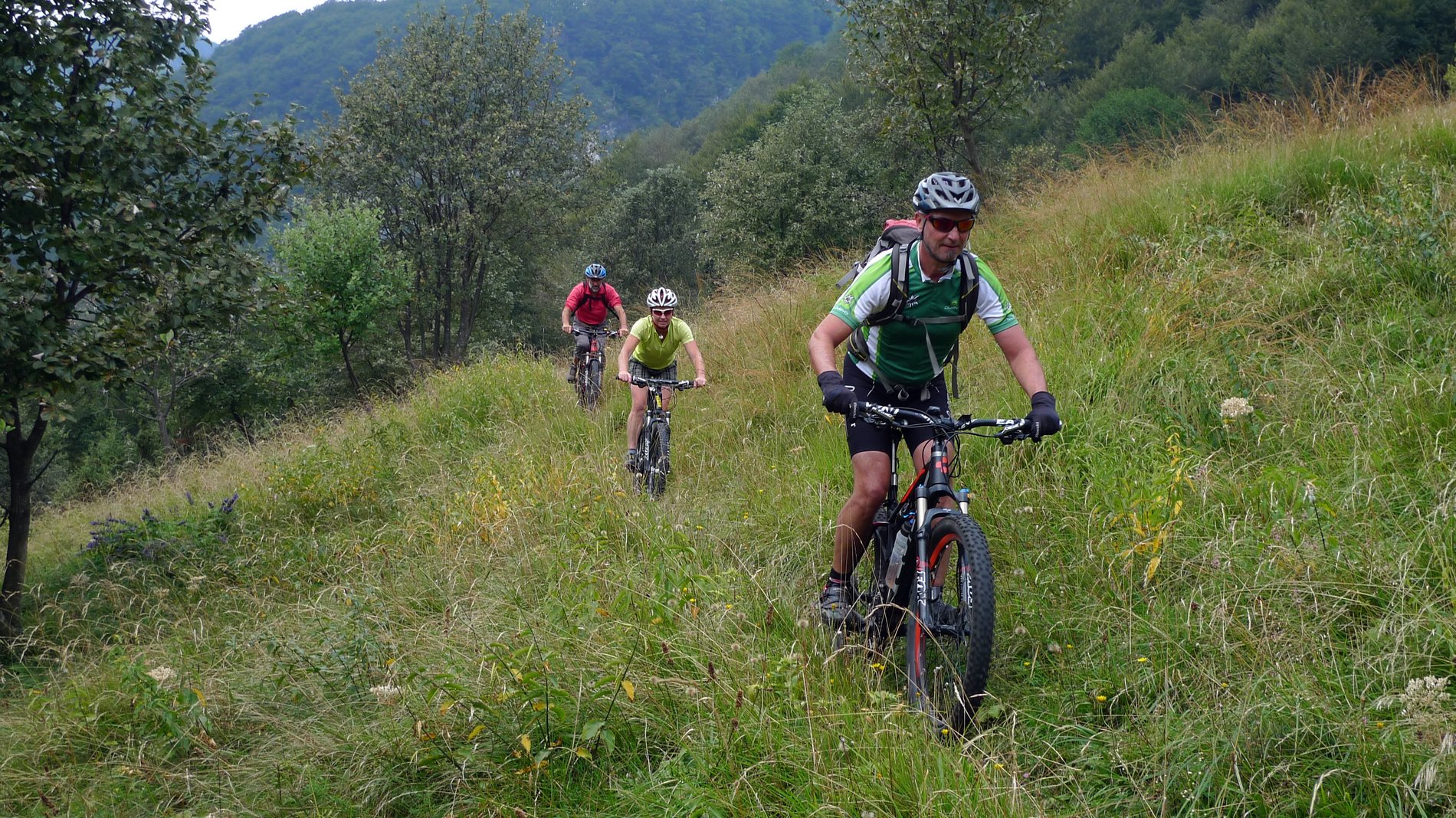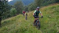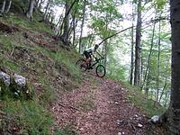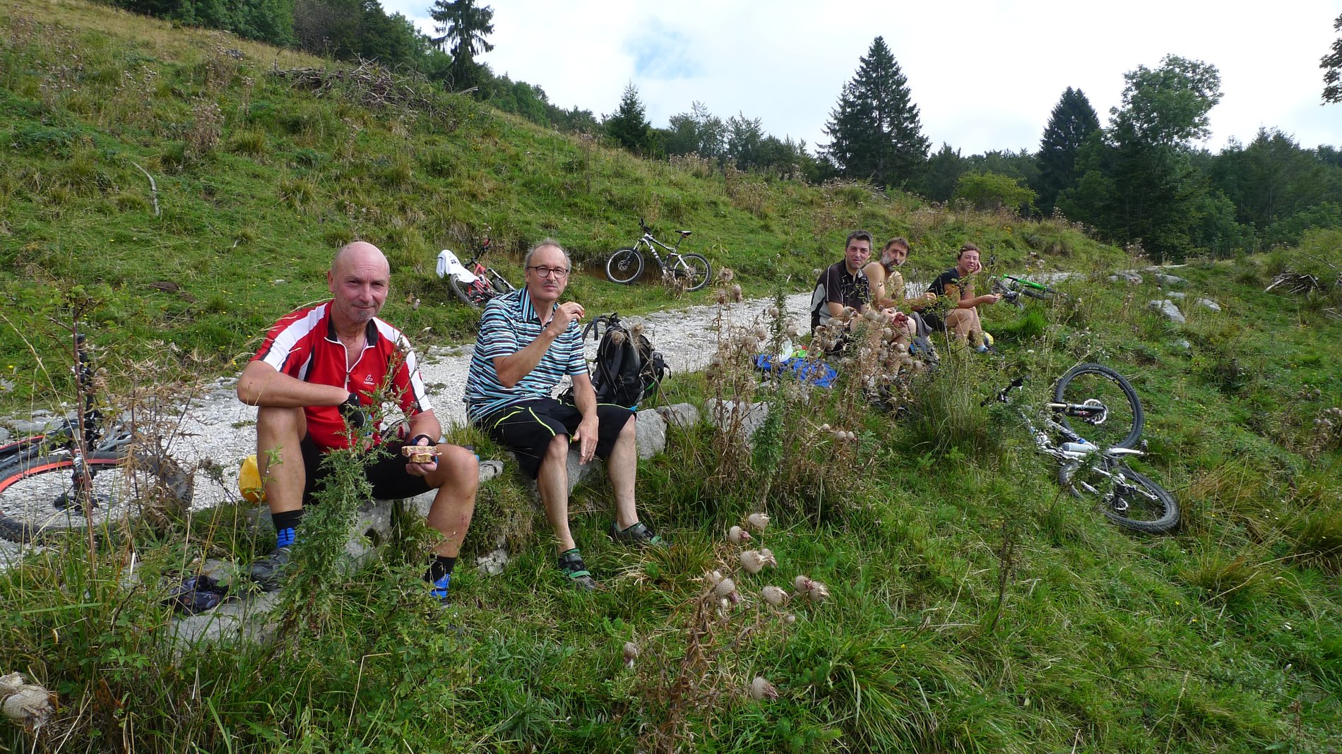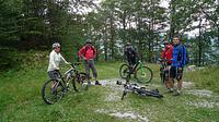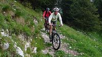 Am ersten Tag starteten wir nach mehrstündiger Anfahrt nach Bovec zu unserer ersten Tour, bei Sonnenschein und optimistischer Wetterprognose für den Tag. Da konnte mancher schon auf die Idee kommen, die Regenjacke wieder auszupacken. Auf einem kaum befahrenen Asphaltsträßchen fuhren wir hinauf nach Camizza in Italien und weiter auf einer Schotterstraße bis kurz unter den Monte Nischiuarch (1 260 m). Die ersten 1000 Hm waren geschafft, und vor uns lagen gut 600 Hm Abfahrt, ausschließlich auf traumhaft schönen und flüssig zu fahrenden Singletrails. Nach kurzer Rast machten wir uns an die 650 Hm lange Auffahrt Richtung Mai Vrh, von wo aus ein 900 Hm langer Trail bis ins Tal zurück führt. Leider hatte es mittlerweile zu regnen angefangen, was die schwierige Abfahrt nicht angenehmer machte und die Übermütigen schnell zur Raison brachte.