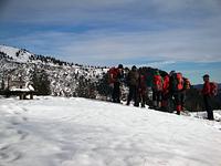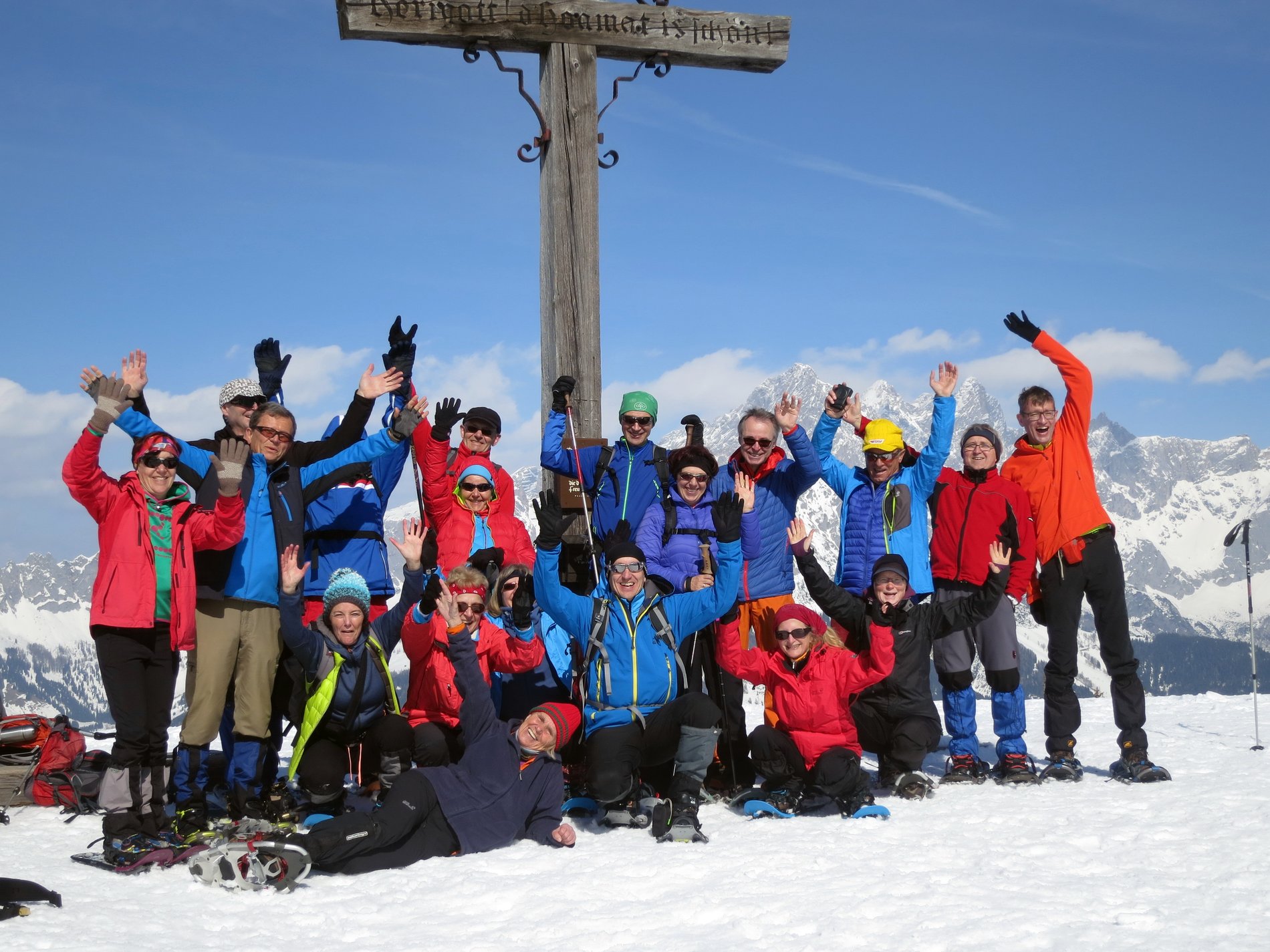 Die letzte Schneeschuhtour der Saison führte uns auf einen im Sommer sogar mit dem Auto erreichbaren Gipfel. Auf unserem Anstiegsweg spielte diese Straße allerdings überhaupt keine Rolle. Wir starteten kurz vor Filzmoos hinein in den Wald und so mancher wunderte sich über die in diesem Tal noch hervorragende Schneelage. Mehr oder weniger entlang des Dr.-März-Weges ging es in herrlichem Schneeschuhgelände hinauf zum Gipfelkamm. Über leicht kupiertes Gelände erreichten wir mit dem Gipfel einen Aussichtspunkt ersten Ranges. Bei bestem Bergwetter bestaunten wir ein 360-Grad-Panorama, wie man es nur selten erlebt. Kein Wunder, dass die Gipfelrast ein wenig länger ausfiel als üblich. Den Abstieg wählten wir über die Karalm, so dass insgesamt eine logische Rundtour zusammenkam. Zu aller Freude fanden wir im Tal eine gemütliche Hütte, in der Vorstand Reinhard Zelger begann, seinen am nächsten Tag stattfindenden Geburtstag zu feiern.