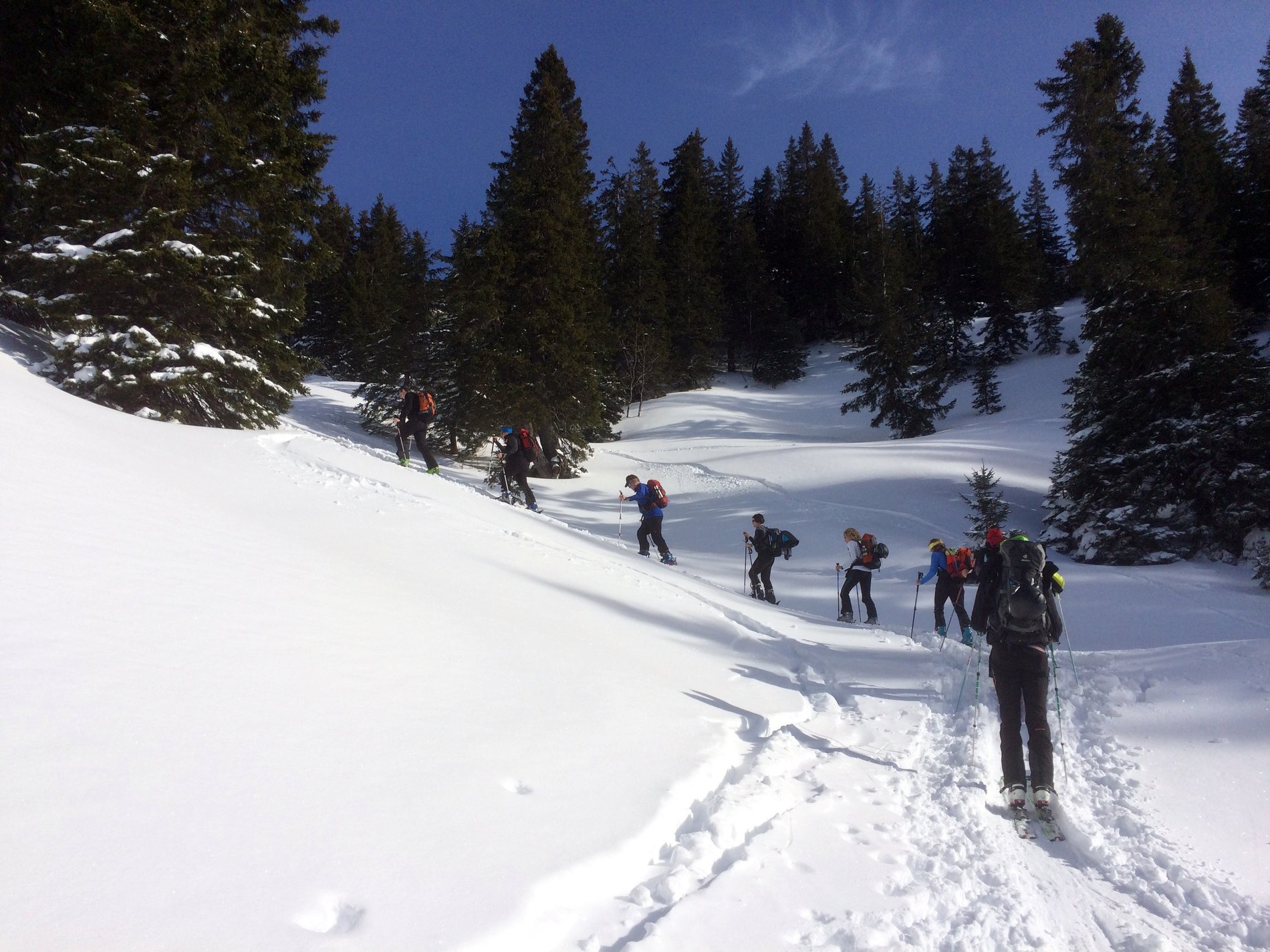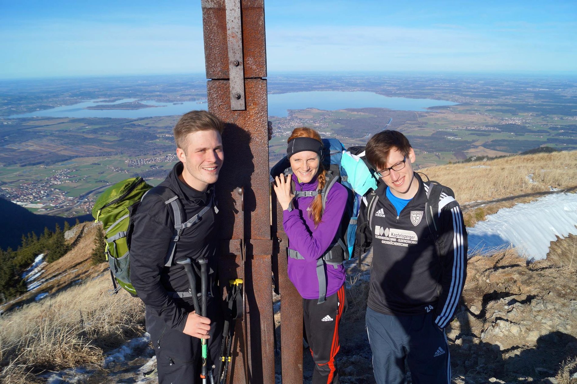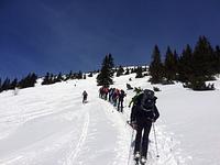 Beim Anstieg über die Jochbergalmen und über die Südseite auf den Hochgern zeigten wir auch den nicht so versierten Skitourengehern im Trockentraining, was eine Spitzkehre ist. Am Gipfel des Hochgern freuten wir uns über die tolle Sicht und das schöne Wetter. Nach einer Einkehr im Hochgernhaus machten wir uns an die „Abfahrt“ über die Forststraße, was aber wegen diverser Einkehrmöglichkeiten die Truppe etwas zerstreute. Eine Skitour ohne Schnee, bei der alle ihren Spaß hatten und was zu erzählen…