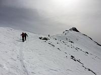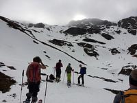 Nach einem längeren flachen Zustieg und einer kleinen Bachquerung standen wir schließlich unter den Gipfelhängen des Torhelms. Bei schönstem und entsprechend warmem Frühlingswetter kam ohne Schwitzen keiner auf den Gipfel. Aber was tut man nicht alles, wenn der Vorstand zur kleinen Geburtstagsfeier lädt und dafür extra in die Berge will.