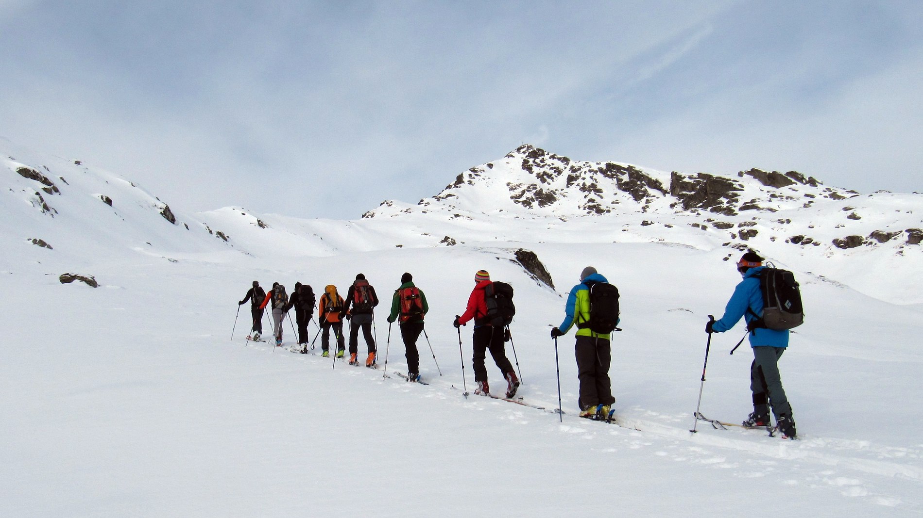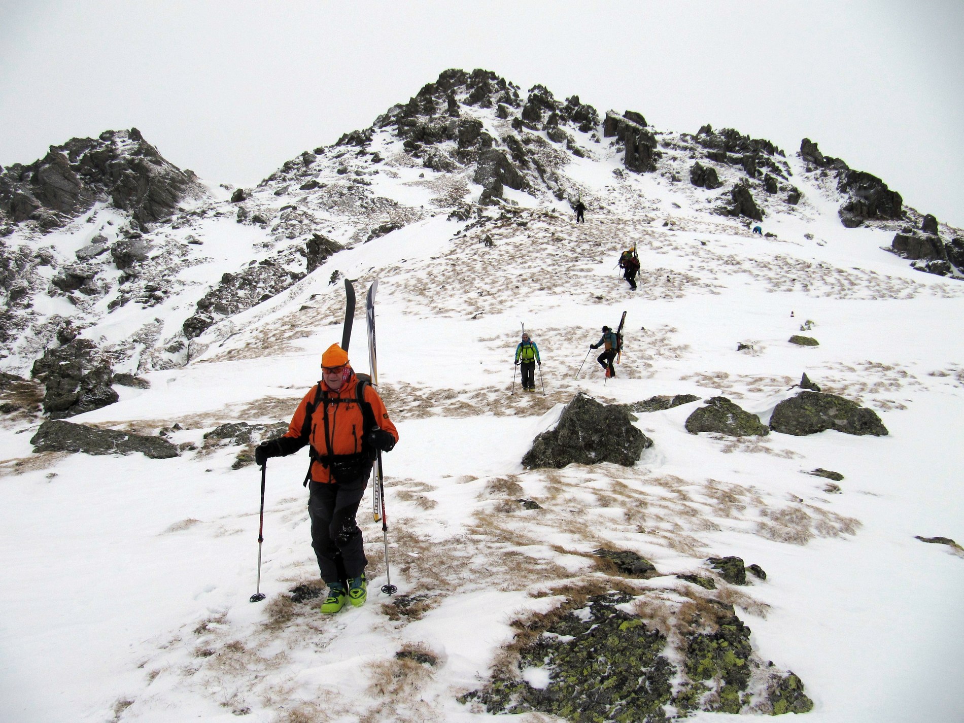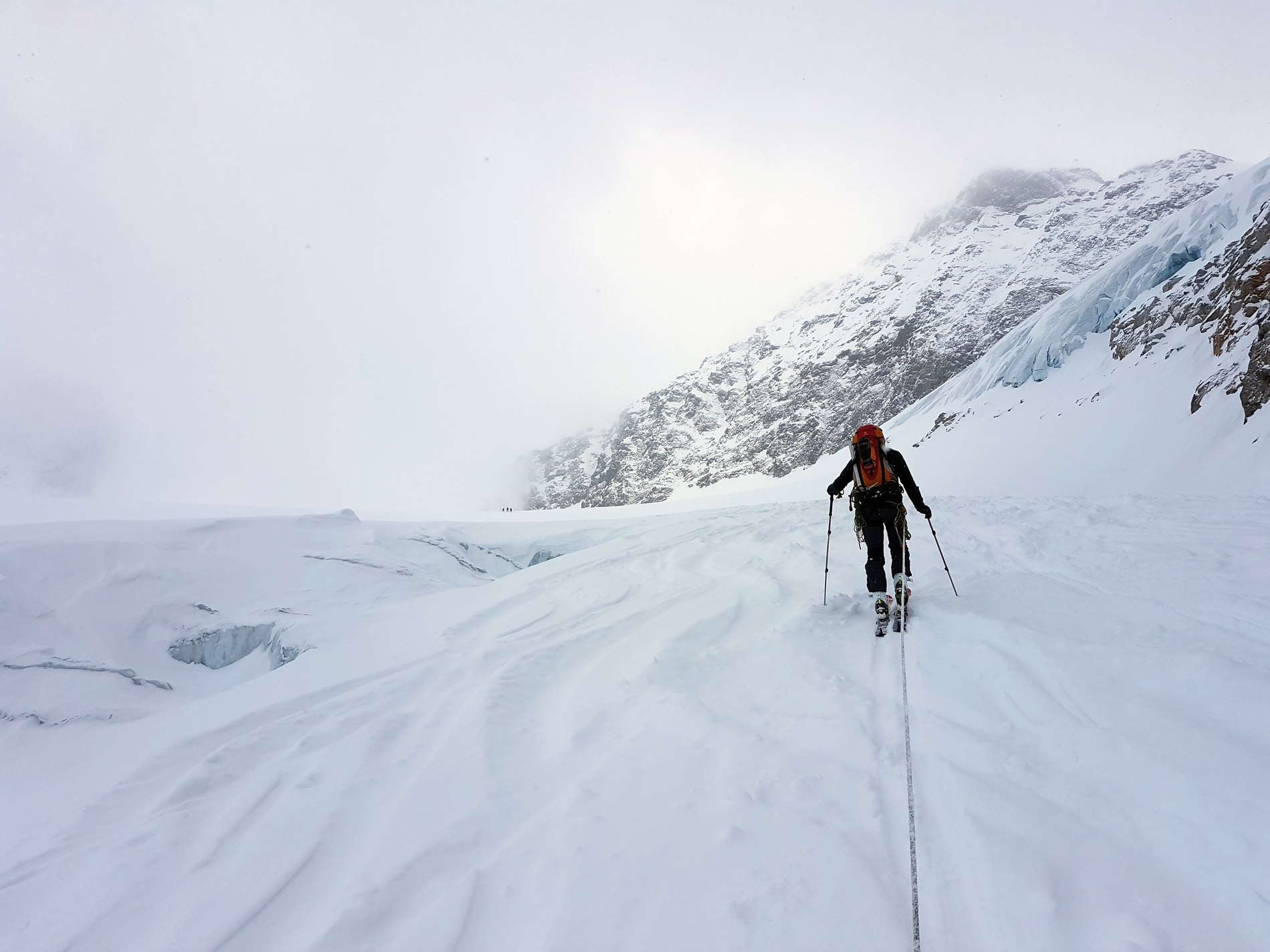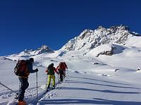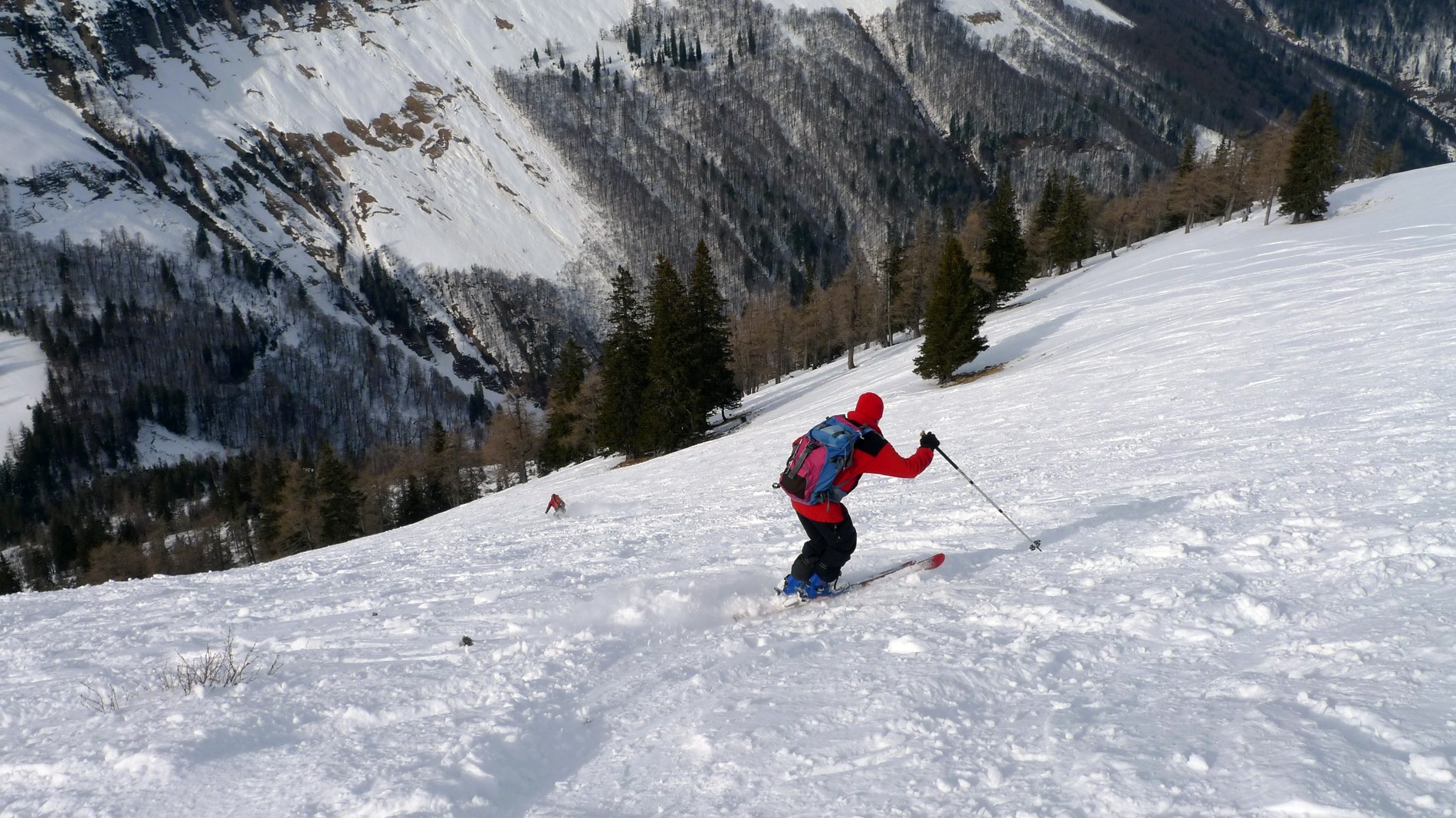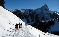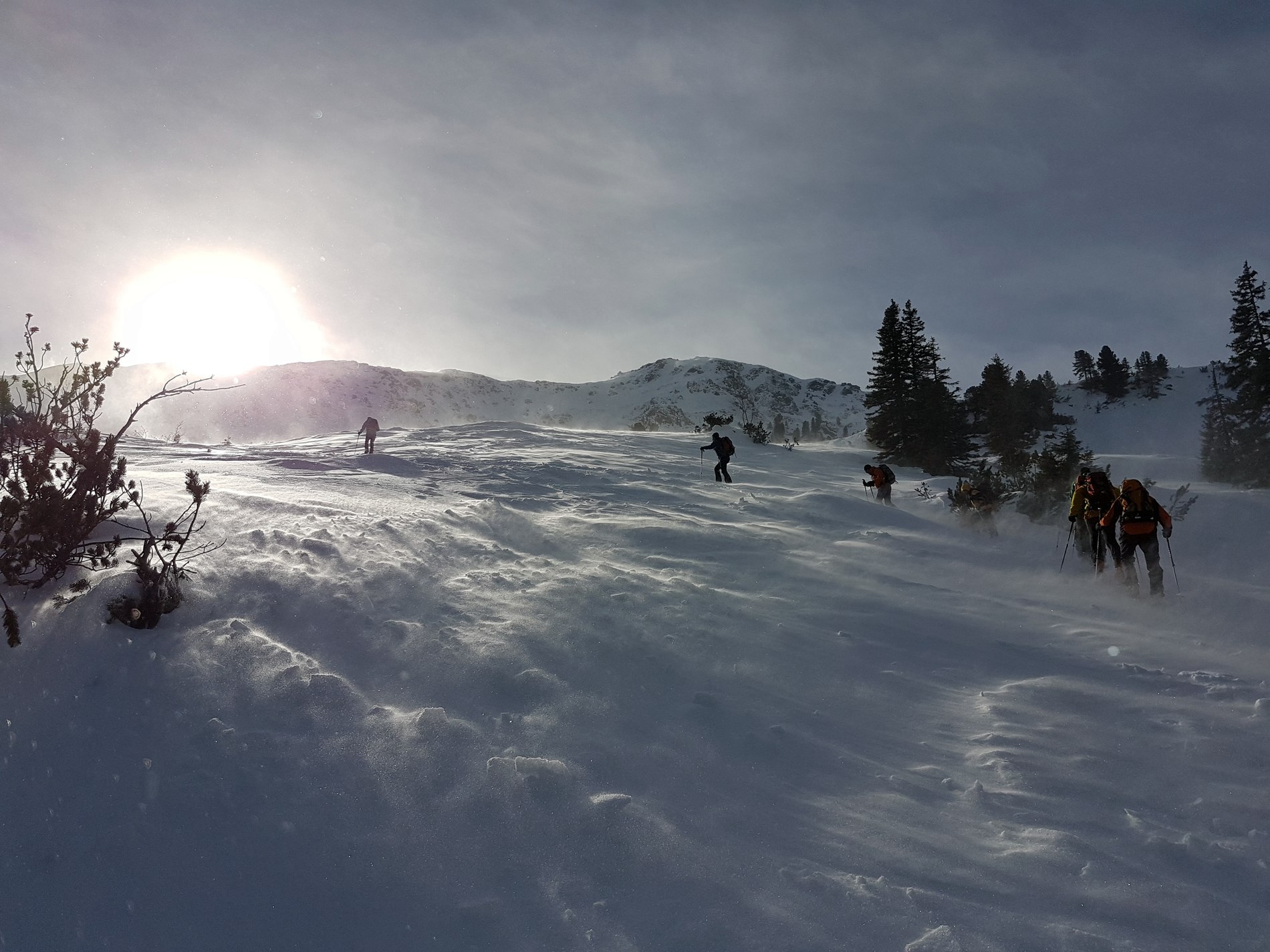 Will man fast alleine auf einer in der Regel gut besuchten Skitour unterwegs sein, dann braucht’s nur zwei Dinge: eine nicht ganz eindeutig gute Wetterprognose und eine halbstündige Tragestrecke. Leider waren wir auch nur zu dritt.