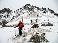 Leider spielte das Wetter nicht ganz mit. Der tiefe Schnee, sehr tief hängende Wolken und etwas Regen zwangen uns zum Abstieg, der allerdings, da die Zeit nicht drängte, in der Tappenkarseealm noch unterbrochen wurde. So ist es halt mal in den Bergen.