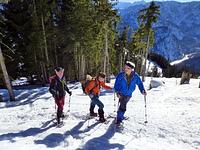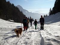 So änderten wir abermals unser Ziel und stapften dem Tauglbach entlang nach Mühlhäusl, wo wir nach einer kurzen Rast den Aufstieg Richtung Feichtenstein begannen. Wegen der traumhaften Schneelage war kräfteraubende Spurarbeit angesagt. Auf der Feichtensteinalm angekommen, entschieden wir uns, hier unsere Gipfelrast einzulegen. Beim Abstieg gab es dank der Schneelage mit einem halben Meter Pulverschnee noch allerlei akrobatische Einlagen. Bei einer gemütlichen Einkehr fand dieser ereignisreiche, anstrengende, jedoch wunderschöne Schneeschuhtag seinen Ausklang.