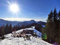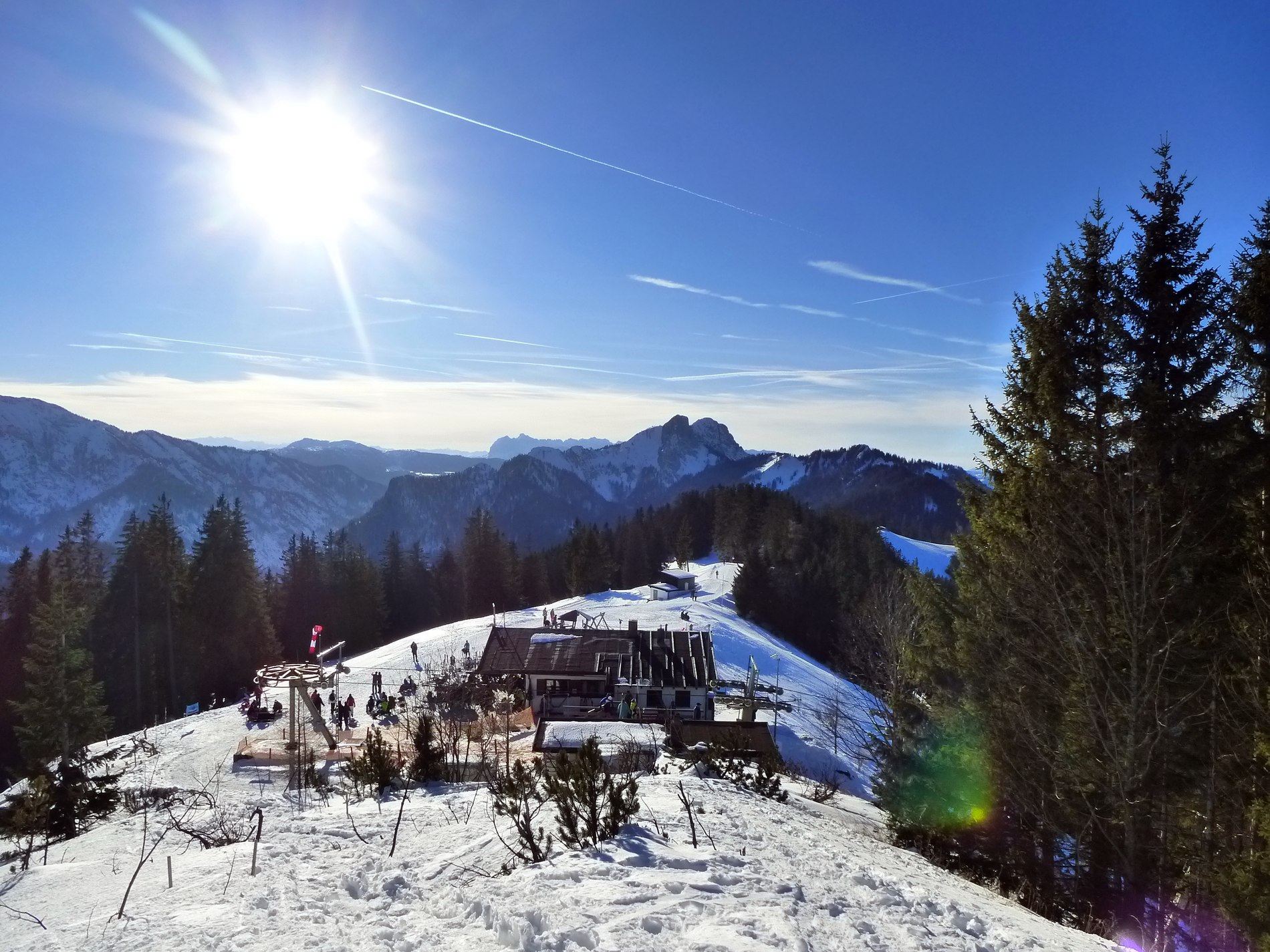 Der Aufstieg dauerte nicht allzu lange und wurde noch bei bedecktem Himmel mit leichtem „Baumschwitzen“ bewältigt. Am Gipfel lag dann immerhin schon etwas Schnee. Während einer ausgiebigen Einkehr in der Kufsteiner Hütte verzogen sich die Wolken. Dadurch konnten wir den traumhaften Ausblick auf den Wilden Kaiser, die Hohen Tauern und auf Kufstein genießen.