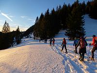 Vom Kühlschrank in die Sonne, so könnte man diese Schneeschuhwanderung bezeichnen. Beim Start in Seehaus herrschten noch knackige Minusgrade, am Gipfel wurden wir von blauem Himmel und frühlingshaften Temperaturen verwöhnt. Der Aufstieg führte uns durch relativ steiles Waldgelände in einsamer Umgebung hinauf zur Bergwachthütte. Von da aus ging es in großen Serpentinen über den von den „Skitourengehern“ zur Piste ausgefahrenen Gipfelhang hinauf zum kleinen Kreuz. Andrea Brandl und Hans Brandl freuten sich, endlich auf einem extra nach ihnen benannten Gipfel zu stehen. Dies wurde mit heilendem Tee gebührend gefeiert. Was den Pistentourengehern recht ist, ist uns Schneeschuhgehern billig. So wanderten wir noch hinüber zur allseits bekannten Unternbergalm und genossen die wärmende Sonne so lang, bis diese langsam aber sicher hinter der Hörndlwand verschwand. Erst jetzt machten wir uns an den Abstieg. Da fast alle Teilnehmer mit einer Stirnlampe ausgestattet waren, wurde die Dunkelheit zu keinem Problem, sondern verlieh der ganzen Tour eine romantische Note.