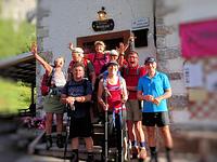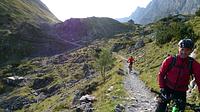 Da am Donnerstag „nur“ die Auffahrt zur Lamsenjochhütte (1953 m) auf dem Programm stand, konnten wir die leichten Regenschauer am Vormittag abwarten. Wir starteten in Jenbach. Über Tratzberg und St. Georgenberg ging’s überwiegend in gut fahrbarer Steigung ins Stallental und hinauf zum Stallenboden, wo wir in eindrucksvoller Karwendelkulisse Pause machten und uns für den extrem steilen Anstieg zur Hütte stärkten.