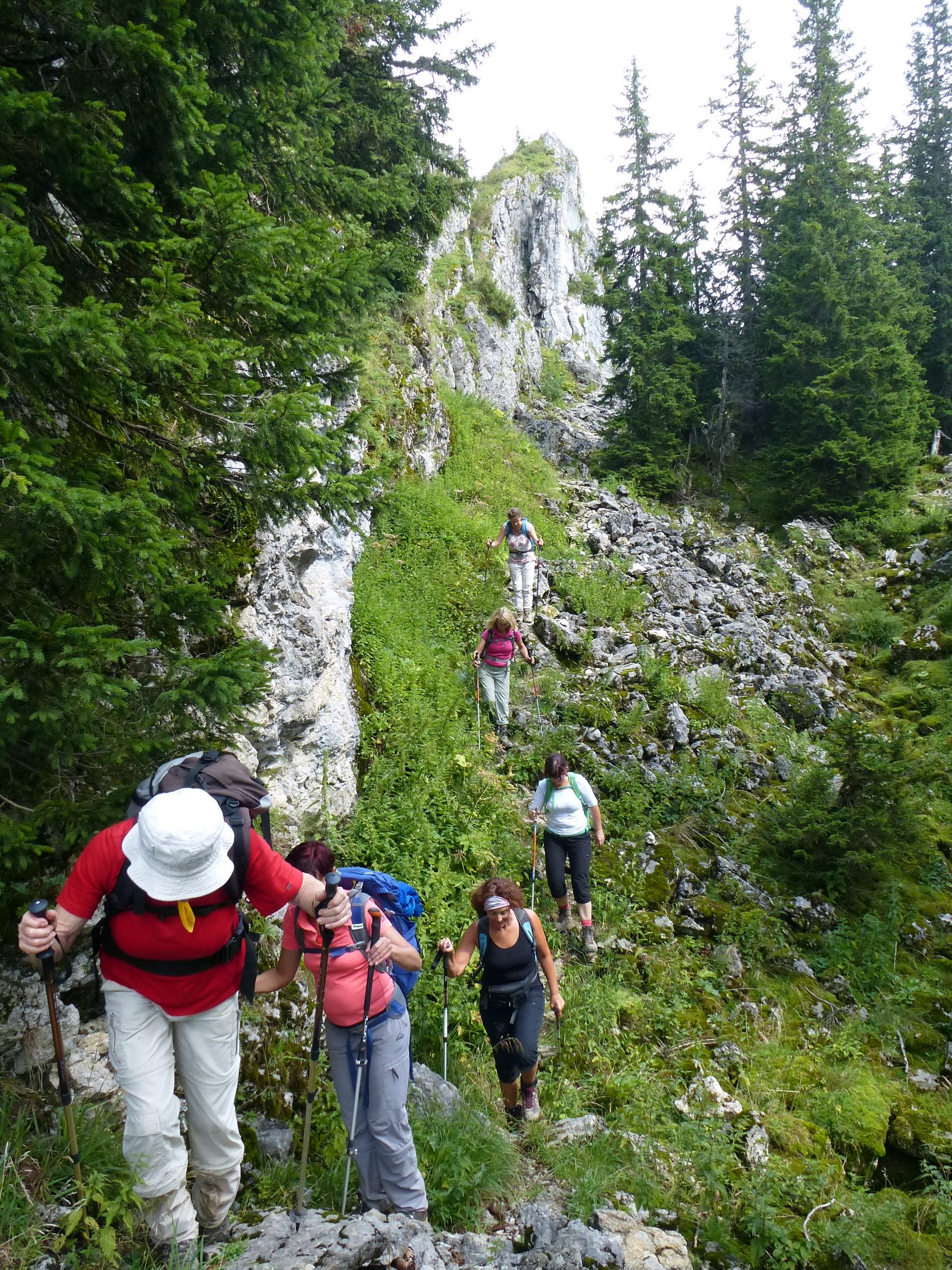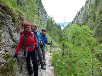 Start unserer ersten Frauentour in diesem Jahr war deshalb der Gasthof Jagerwirt in Burgbachau am Attersee. Wir wählten als Aufstiegsroute den „Erzherzogin-Valerie-Weg“ durch die beeindruckende Burggrabenklamm. An der „Magdalenenquelle“ vorbei ging es unschwierig, aber durchaus ein wenig ausgesetzt bis zur Eisenauer Alm. Dort gönnten wir uns eine längere Pause in der Sonne (!) auf der Terrasse der Buchberghütte.