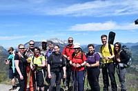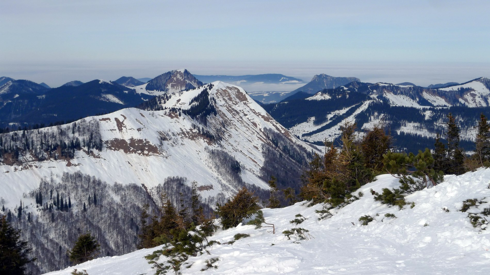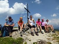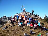 Nach dem abwechslungsreichen Anstieg – von flachen Wegen über gestuftes Gelände und steile bewaldete Hänge bis zum freien Gipfelhang war alles dabei – genossen wir die Aussicht und natürlich auch die Brotzeit am Gipfel.