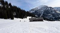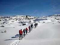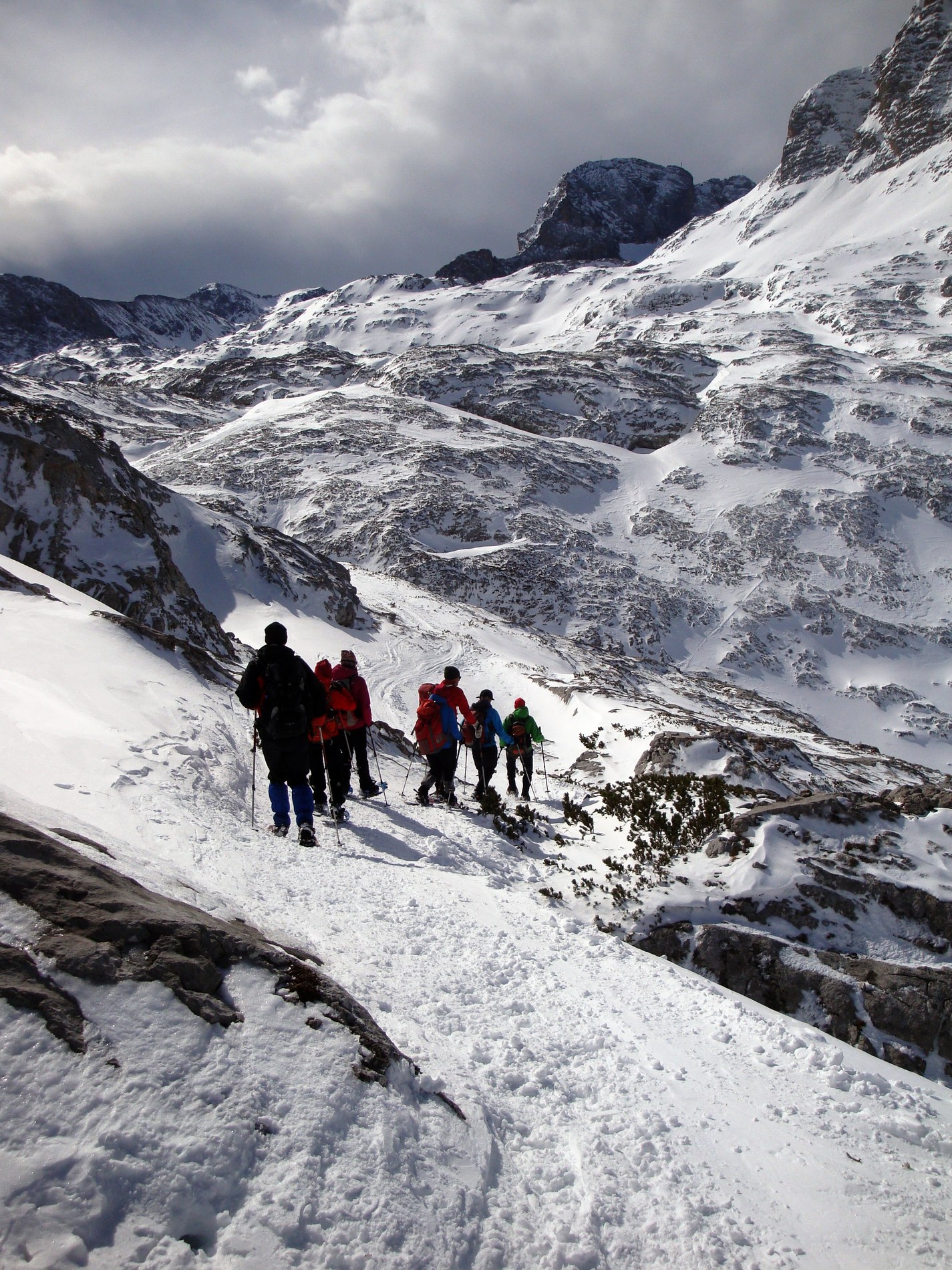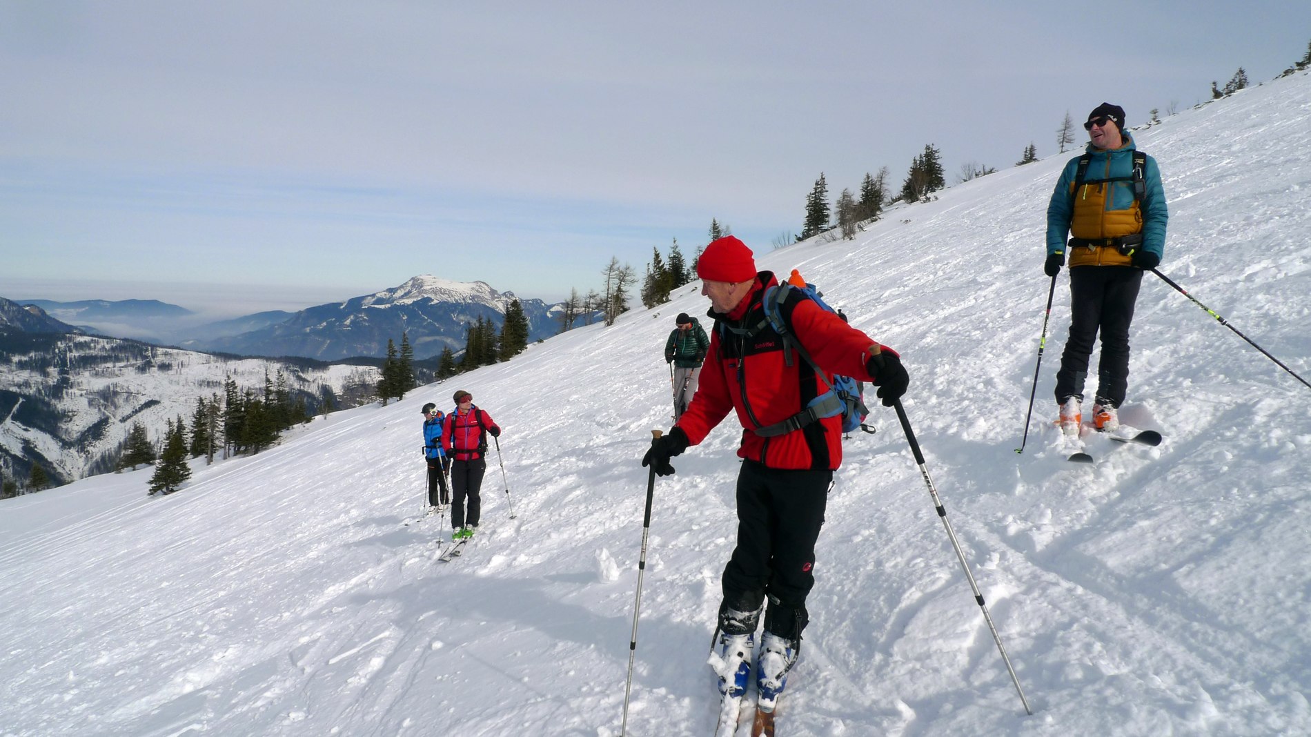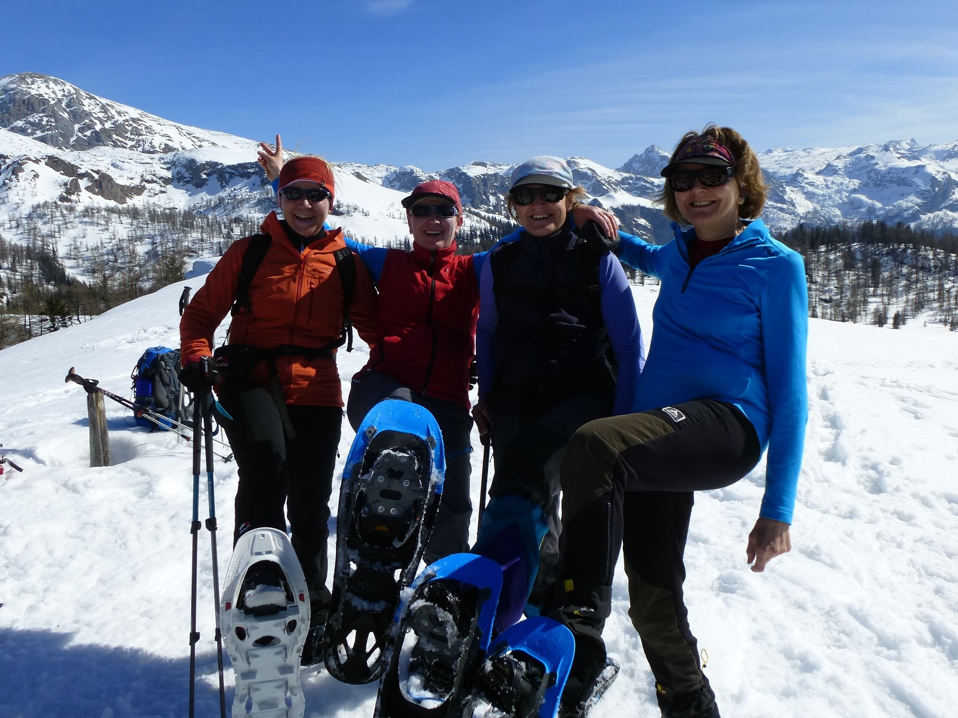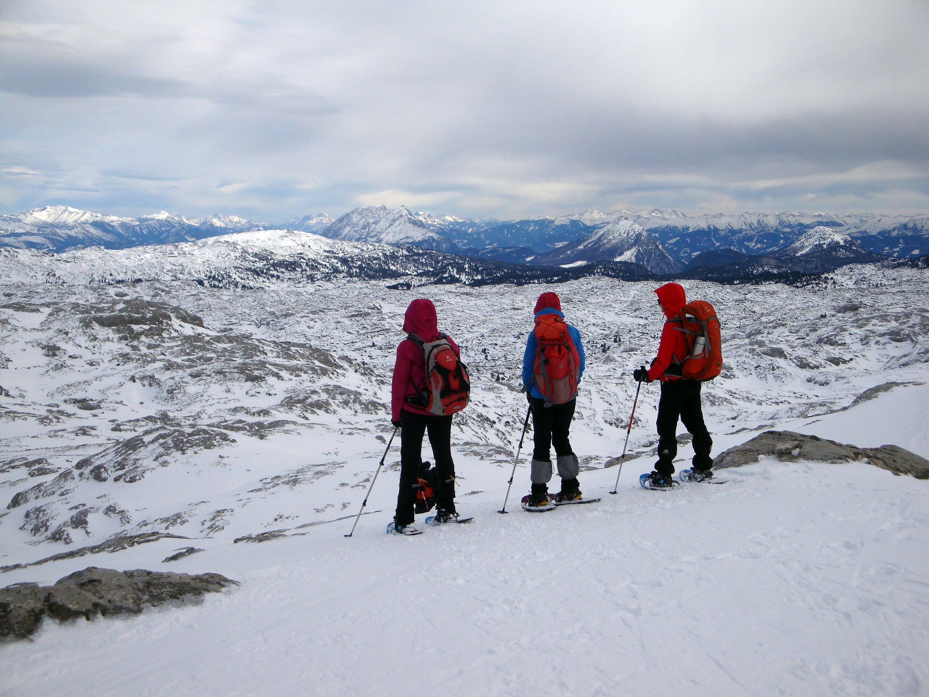 Leider bot das geplante Zirbenland zu dieser Zeit keine bzw. nur sehr schlechte Schneeschuhmöglichkeiten. Also entschieden wir uns für die auf dem Dachsteinplateau hoch gelegene Gjaidalm. Und diese Entscheidung sollten wir nicht bereuen. Die Gipfel von Margschier (2080 m), Hohen Trog (2359 m) und Mitterstein (2417 m) konnten wir mit den Schneeschuhen erreichen. Das Wetterangebot reichte von wolkenlos bis bedeckt. Auf der Gjaidalm wurden wir von der aus Altötting stammenden Wirtin bestens versorgt. Lediglich am Dienstag zwang uns starker Nebeleinfall, die geplante Tour abzubrechen und mit der Seilbahn ins Tal zu fahren. Alles in allem wunderbare Schneeschuhtage vor der großen Kulisse des Dachsteinmassivs.