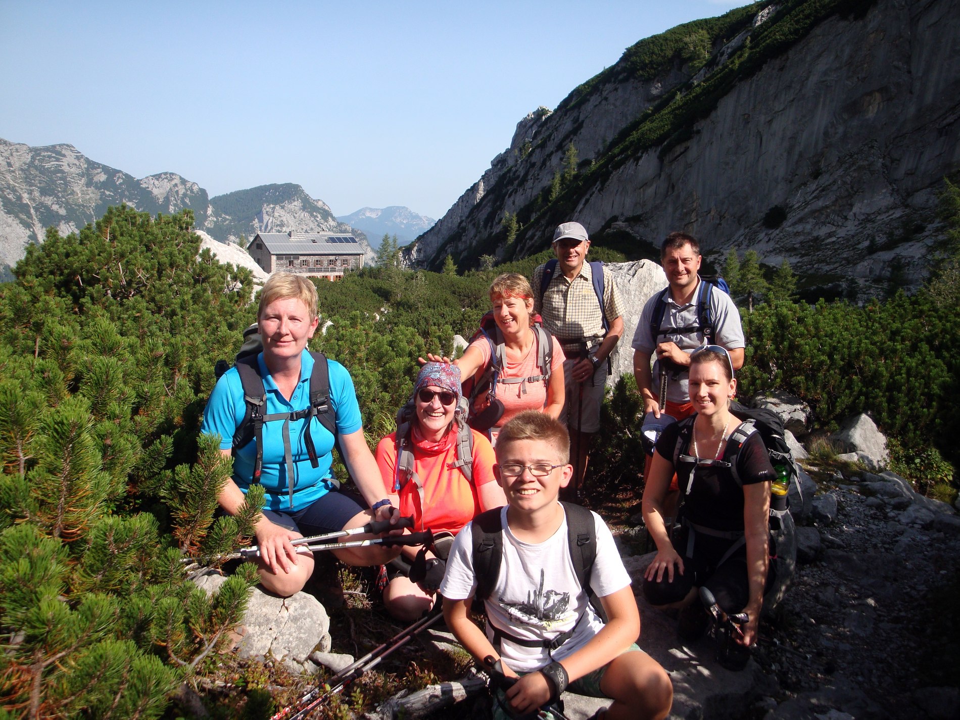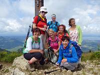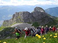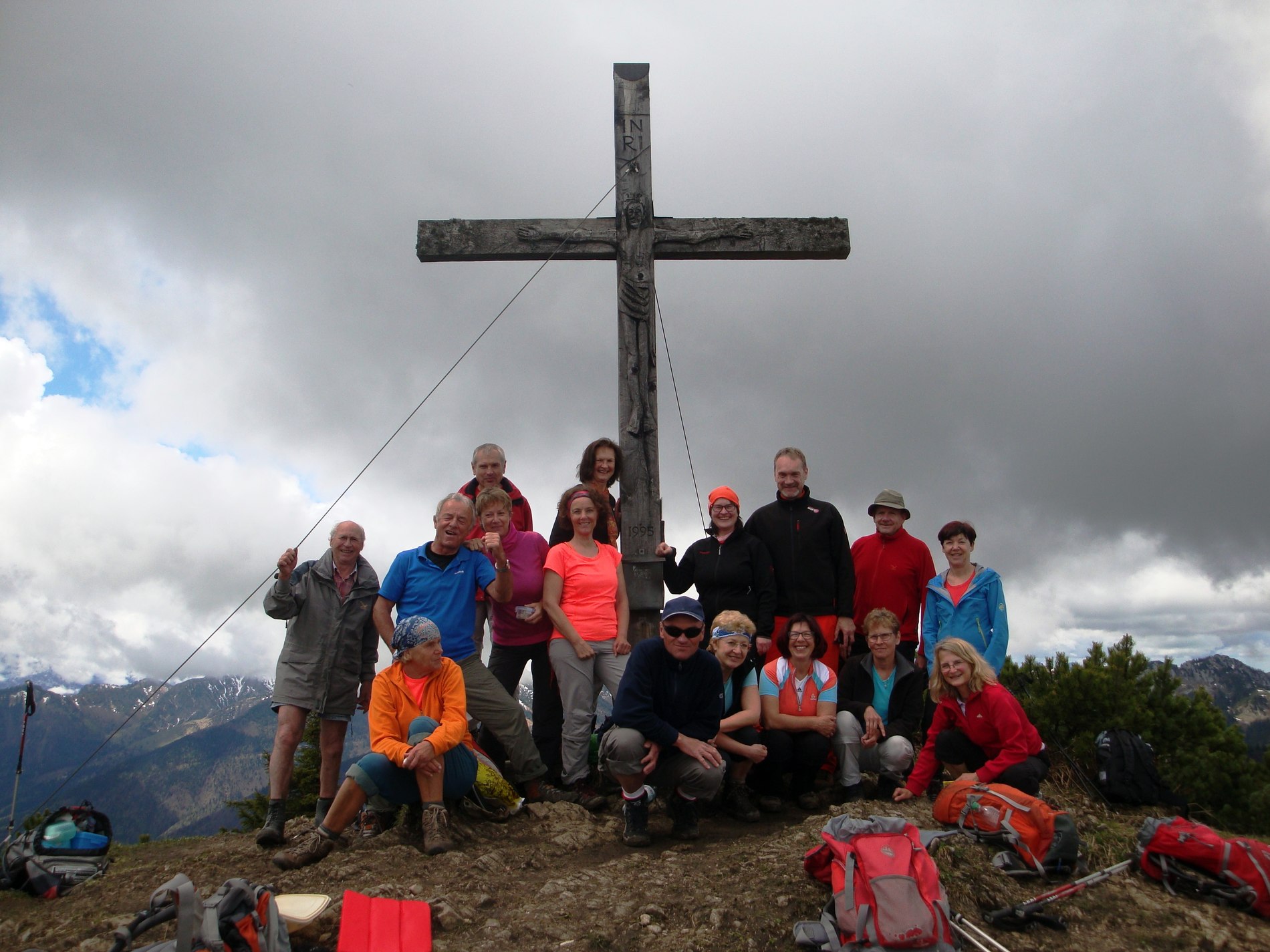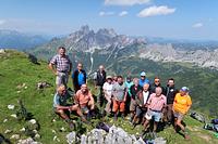 Bei bestem Wetter marschierten die acht Bergsteiger vom Parkplatz Dientener Sattel, vorbei an der Erichhütte (1545 m), über eine mit Enzian übersäte Almwiese, dem Gipfel entgegen. Dann führte der markierte Pfad durch Latschen und über Geröll stetig steil bergauf. Im letzten Abschnitt gab es einige ausgesetzte Stellen, gesichert mit Stahlklammern und einer Leiter. Aufpassen musste man schon. Der Gipfel auf 2159 m Höhe ist ein echter Logenplatz. Man genoss den Blick vom Dachstein über die Niederen Tauern und die schneebedeckten Dreitausender der Hohen Tauern, mit Großglockner, dem markanten Großen Wiesbachhorn, bis zum Großvenediger.