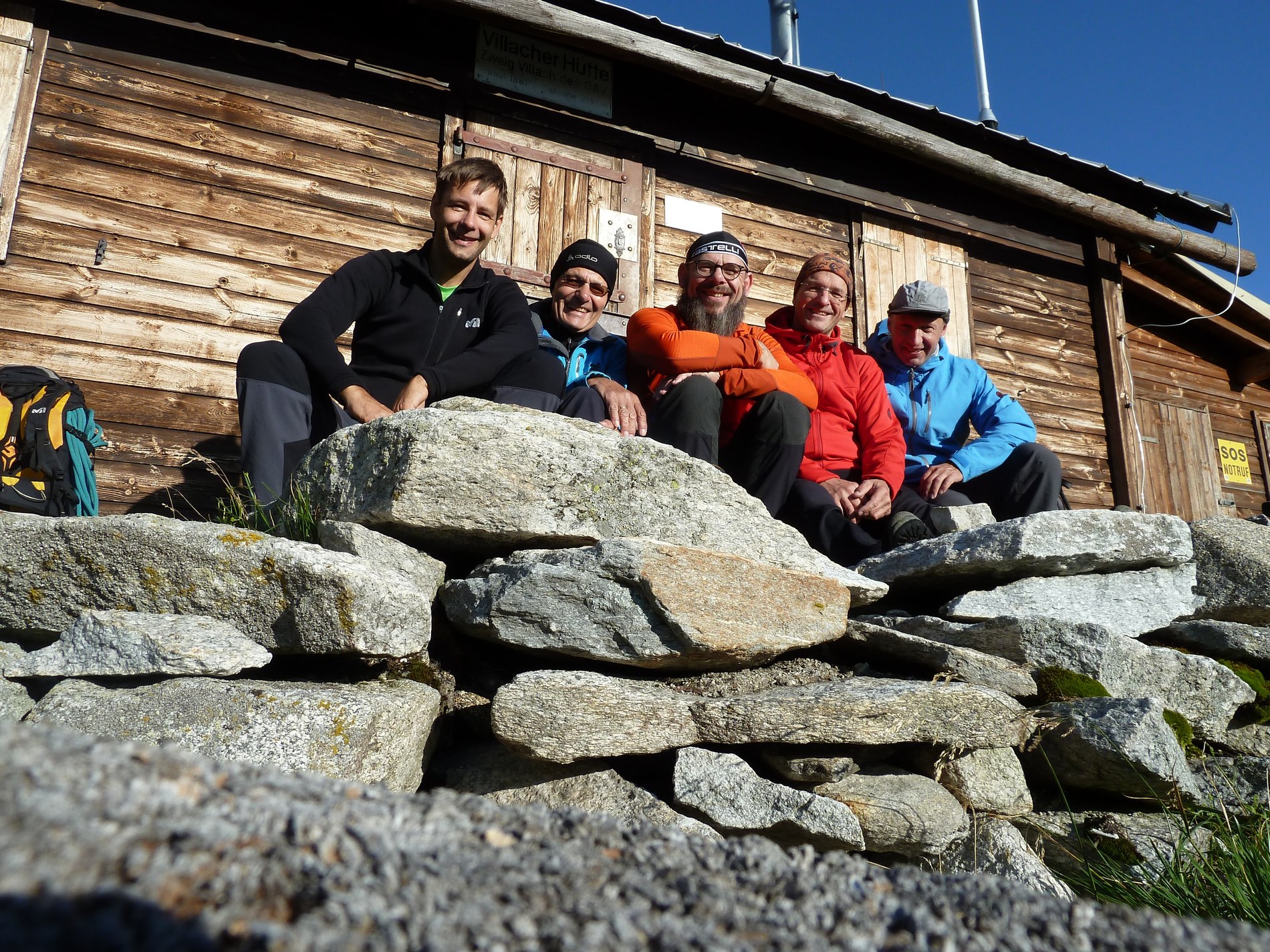 Abseits des vielbesuchten Klassikers „Detmolder Grat“ fanden wir sehr einsame Pfade zur Hochalmspitze. Am frühen Nachmittag stiegen wir vom Maltatal aus über schmale Wege zur Villacher Hütte (2194 m). Da die Villacher Hütte eine kleine, aber griabige Selbstversorgerhütte ist, befanden sich in unseren Rucksäcken Unmengen von Spaghetti und natürlich der dazu passende Rotwein. Ebenso griabig verlief auch unser Aufenthalt in dieser Unterkunft.
