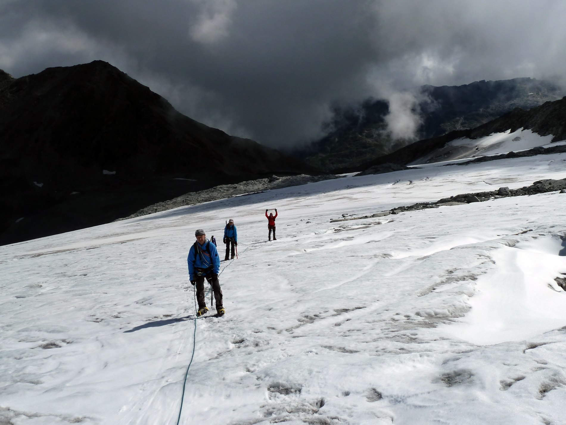 Nach dem Großelend kam das Kleinelend! Und so ging unser nächstes Ziel, der Ankogel (3252 m), über das Kleinelendkees! Schnell merkten wir, dass die gut besuchte Hütte hauptsächlich Hüttenwanderer beheimatete. Im alpinen Gelände und auf dem Gletscher waren wir wieder allein unterwegs. Am Gletscher selbst fanden wir noch einigermaßen gute Bedingungen vor. Doch im Gipfelaufbau war eine weitere Besteigung nicht ohne Sicherung möglich. Da unsere „Umkehrzeit“ schon ziemlich ausgereizt war, verzichteten wir auf die letzten 30 bis 40 Höhenmeter und kehrten auf dem gleichen Weg, welchen wir im Aufstieg her kamen, zur Hütte zurück. Ab der Osnabrücker Hütte war noch ein 8,5 km langer Talhatscher zu bewältigen, bevor es mit dem Vereinsbus zurück in die Heimat ging.