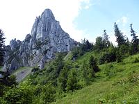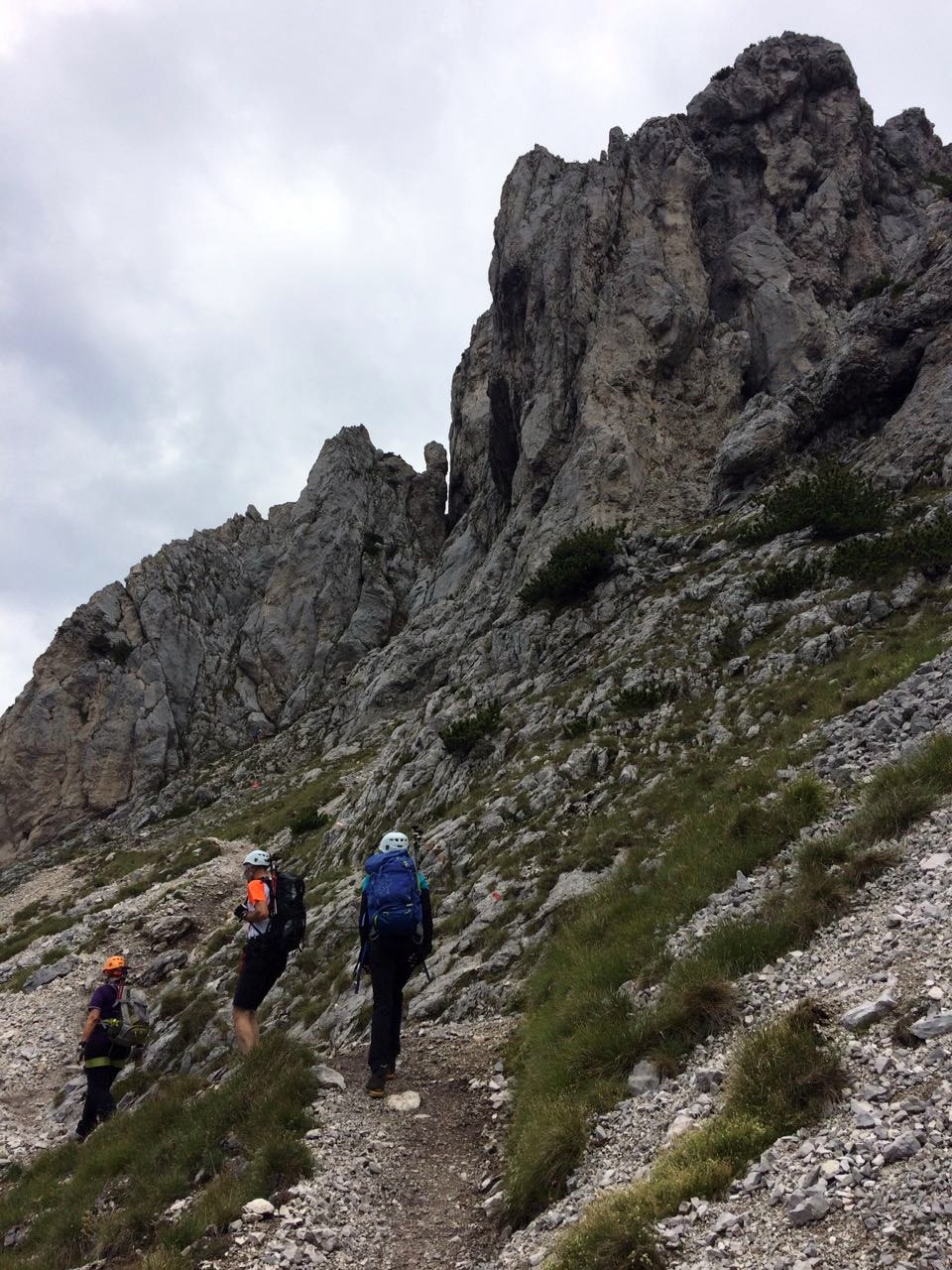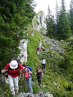 Bis zur Hörndlalm war der Aufstieg recht einfach und die markante Form des Gipfels zeigt sich hier von ihrer schönsten Seite. Im Jagersteig mussten wir durchaus Hand anlegen, um im steilen Gelände vorwärts zu kommen. Die Gipfelrundschau war leider durch tiefhängende Wolken und einsetzenden Regen stark beeinträchtigt.