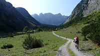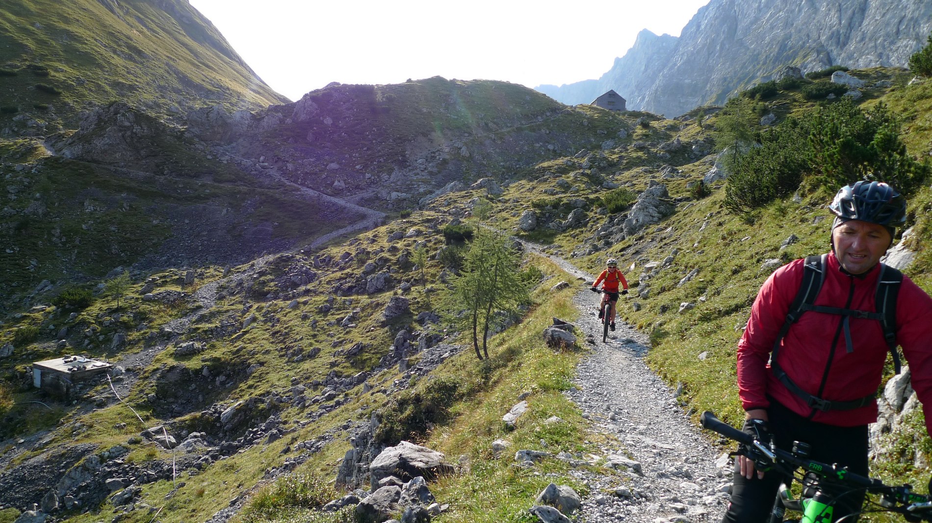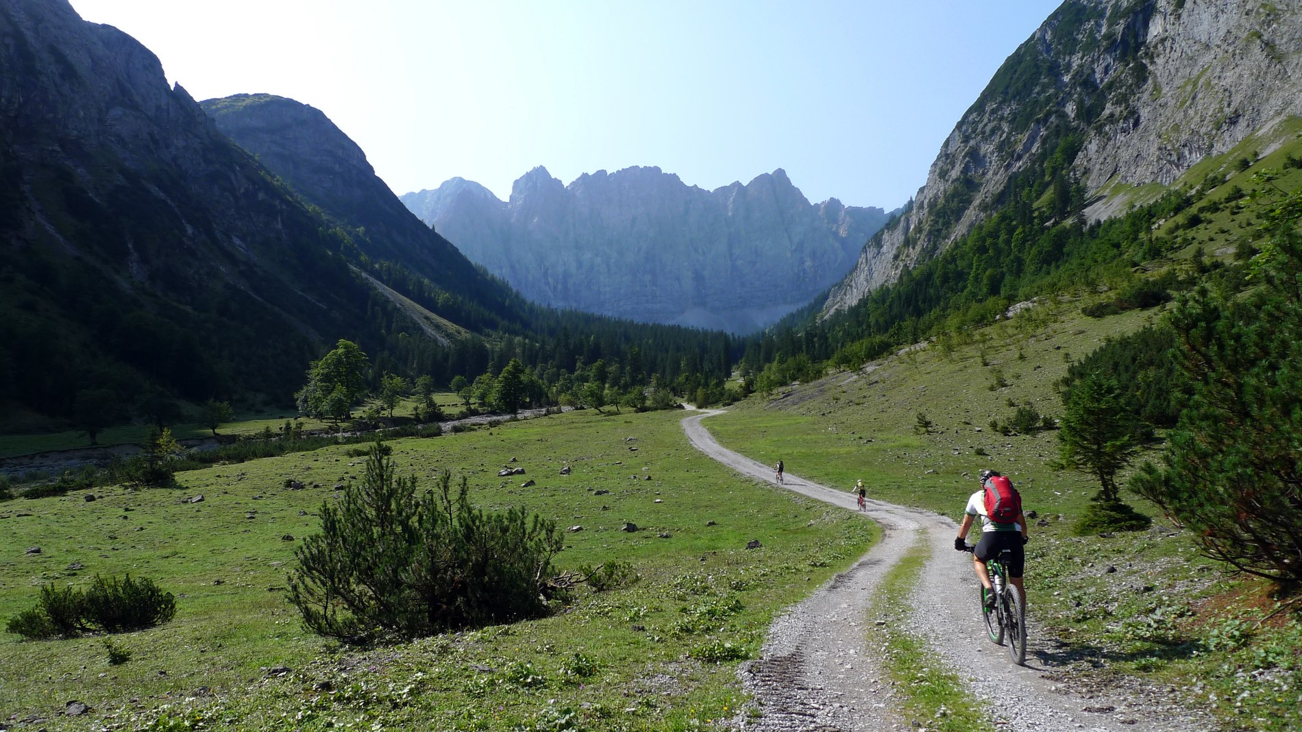 Nach gemütlichem Frühstück stand zunächst die Abfahrt überwiegend auf Singeltrails in die Eng auf dem Programm. Nach kurzer Rast rollten wir durch den Großen Ahornboden hinaus ins Rißbachtal und nach ein paar weiteren Kilometern bogen wir ab hinauf ins Laliderer Tal und weiter hinauf bis ins Spielissjoch und zur Falkenhütte, wo wir uns grad richtig zur Mittagszeit zu den Dutzenden E-Bikern und ein paar Mountainbikern gesellten. Weiter ging’s hinunter ins Johannestal und wieder rauf zum Karwendelhaus, immer entlang der beeindruckenden Felswände des Karwendels. Durchs weite Karwendeltal und auf einem schönen Trail hinunter nach Scharnitz konnten wir es krachen lassen, bevor es wieder flacher entlang der Isar bis nach Mittenwald zur Jugendherberge, unserem zweiten Quartier, ging.