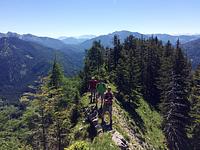 Bei strahlendem Sonnenschein wanderten wir vom Ausgangspunkt an der Valepp-Alm entlang der Gumpen und Wasserfälle des Bernauer Baches hinauf zur Schönleitenalm, wo der Steig (offiziell) endete. Weglos ging es über steile Wiesenflächen, die rassige Lahnerscheid zum Lahnerkopf und durch etwas verwinkelte Latschengassen und kleine Felsstufen anregend weiter über das Lahnereck zum Sattel am Riedereck. Im Troß der Münchner Bergwanderer und über den teils seilversicherten Nord- und Ostgrat führte der letzte Anstieg nochmals schweißtreibend zum Gipfelkreuz des Risserkogels, der eine großartige Aussicht vom Großglockner über Großvenediger bis hin zur Zugspitze bot. Der nahezu einsame Abstieg über den Südgrat und die Bernauer-Alm zurück zum Ausgangspunkt ergab somit eine schöne, aber auch ausgedehnte Rundtour. Die verdiente Einkehr in der Moni-Alm und ein erfrischendes Bad im Tegernsee rundeten einen herrlichen Sommertag ab.