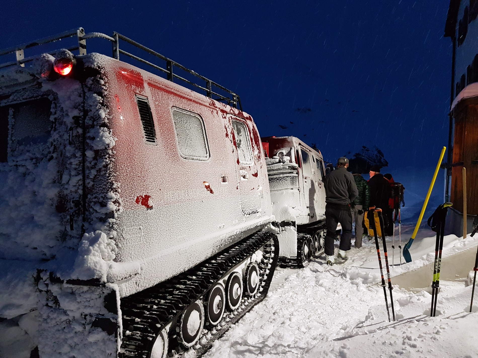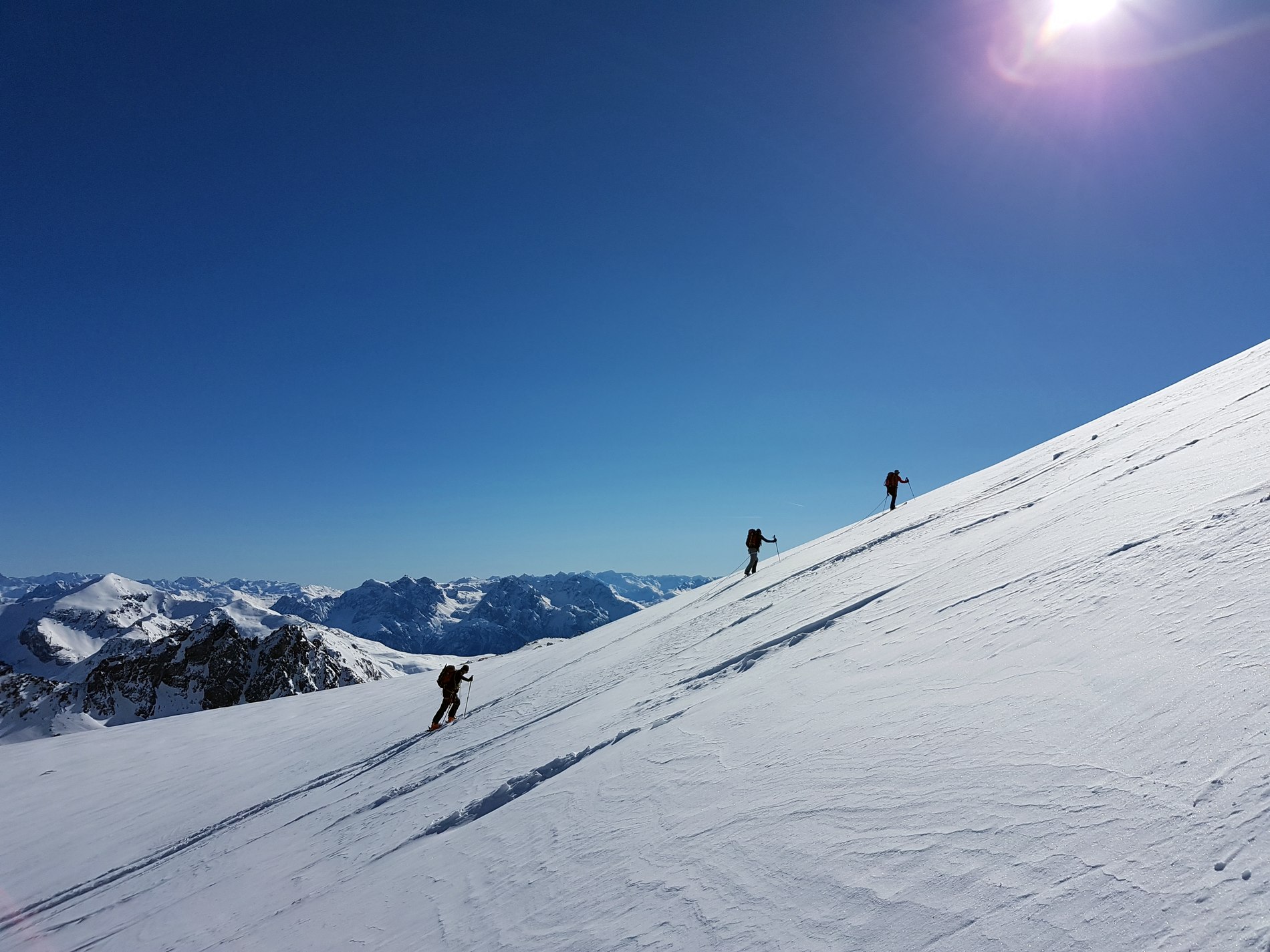 Der erste Tag brachte uns bereits einige Höhenmeter, die wir allerdings im Radtrack von Ischgl hoch zur Heidelberger Hütte zurücklegten. Pünktlich zu unserer Ankunft auf der Hütte begann es zu schneien und hörte auch erst wieder am frühen Morgen auf. Kurz darauf starteten wir bei blauem Himmel und Sonnenschein in unseren ersten Tourentag, der uns über den Piz Larain (3009 m) und die Schnapfenspitze (3219 m) zur Jamtalhütte brachte.