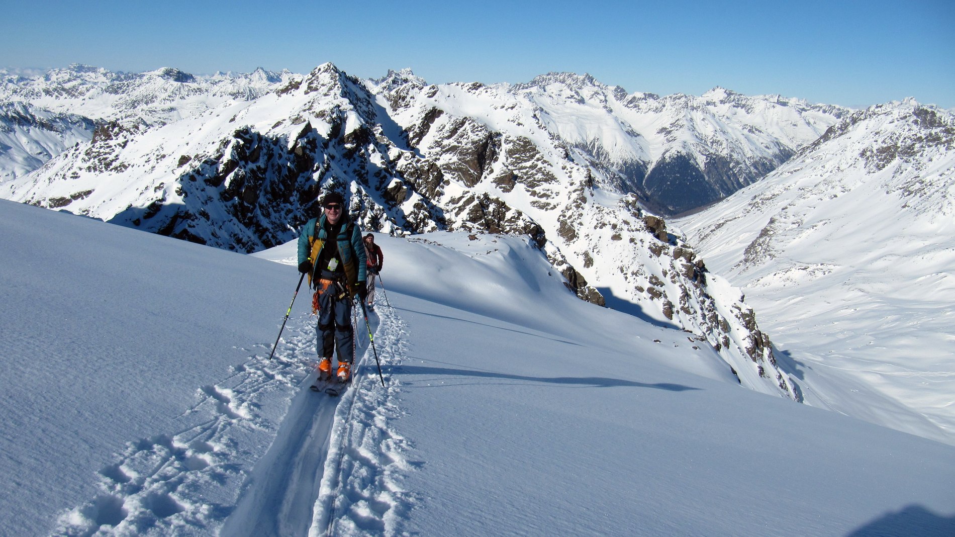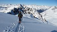 Der Schneefall der vergangenen Nacht hatte uns einen traumhaften Tag gebracht, er hat aber gleichzeitig auch die Steine mit Pulver bedeckt, was unsere Skier dann doch gar nicht so lustig fanden. Weiter ging es über die Hintere Jamspitze (3156 m) und die Dreiländerspitze (3197 m) zur Wiesbadener Hütte.