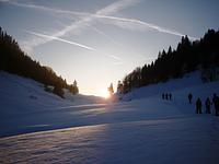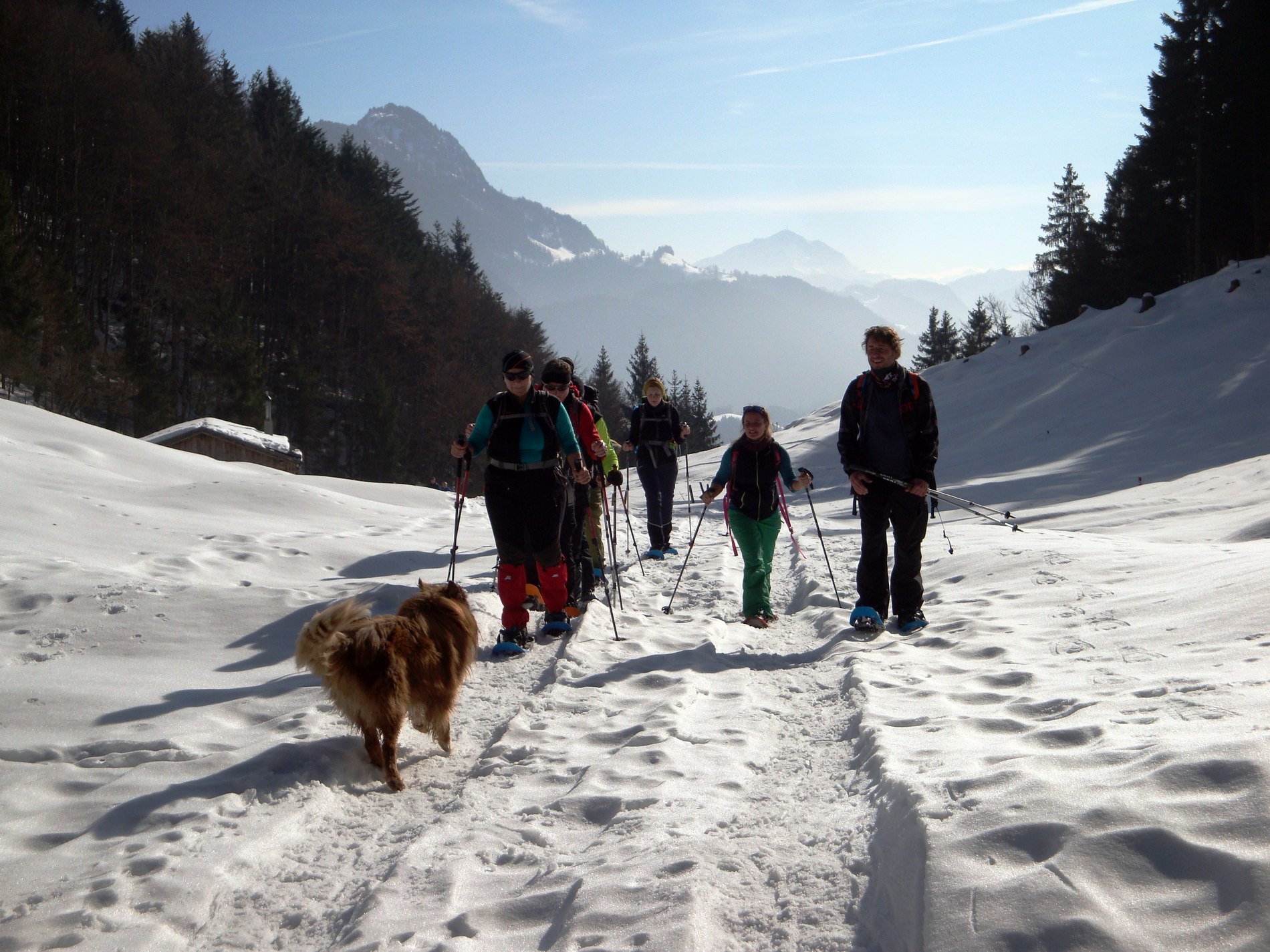 Obwohl das ausgeschriebene Ziel nicht gerade als alpines Aushängeschild gilt, konnten wir uns über eine mangelnde Tourenbeteiligung nicht beklagen. Wahrscheinlich lag es wohl doch mehr daran, dass viele dem Reiz des Vollmondes nicht widerstehen konnten. Neben ausreichend Teilnehmern fanden wir glücklicherweise auch noch ausreichend Schnee vor, so dass wir gleich vom Parkplatz weg mit Schneeschuhen gehen konnten. Vorbei an der Edernalm ging es auf eigenen Wegen zum Vorgipfel des Rescharkopfes, welcher außer einer tollen Sicht zum Wilden Kaiser nichts zu bieten hat. Im Licht der langsam untergehenden Sonne stiegen wir auf der anderen Seite des Gipfels ab und visierten unser Ziel, die Edernalm, an, wo uns der Wirt Hans bereits erwartete. Nach guter Bewirtung ging es in der Dunkelheit bestens gelaunt ins Tal.