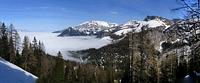 Für die letzte Schneeschuhtour des Jahres hatten wir uns einen etwas längeren Weg vorgenommen, der sich letztlich auszahlen sollte. Ausgehend vom Parkplatz Hinterbrand über dem Königssee ging es vorbei an der hässlichen Jennerbahn-Baustelle zur Königsbachalm. Bald nach der Gotzentalalm konnten wir die Schneeschuhe anschnallen und im immer tiefer werdenden weichen Schnee stapften wir über einen steilen Hang hinauf zum grandiosen Aussichtspunkt Feuerpalven. Hier genossen wir ausgiebig den faszinierenden Blick in die winterliche Watzmann-Ostwand. Nach wenigen Minuten war dann auch unser Tagesziel, der Gipfel des Wartegg, erreicht. Bei blauem Himmel und Hochnebel im Tal verschlug uns der Rundblick über das Steinerne Meer fast die Sprache. Aber nicht lange, denn schon bald sprangen wir bestens gelaunt im weichen Schnee hinunter zur Schneegrenze. Der Rückweg über den Forstweg zog sich dann etwas, so dass am Ende über 1100 Höhenmeter Anstiegsleistung zusammenkamen.