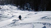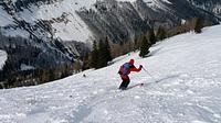 Die Abfahrt erfolgte auf gleicher Strecke. Und obwohl der Hohe Zinken ein gern besuchtes Ziel ist, fanden wir sogar noch unverspurtes Gelände, wo sich jeder nach Lust und Laune austoben konnte. Für die letzten paar Hundert Höhenmeter zum Parkplatz nahmen wir die Forststraße. Ganz so viel Schnee, daß eine Abfahrt im dichten Wald möglich gewesen wäre, lag in den unteren Lagen dann doch nicht.