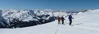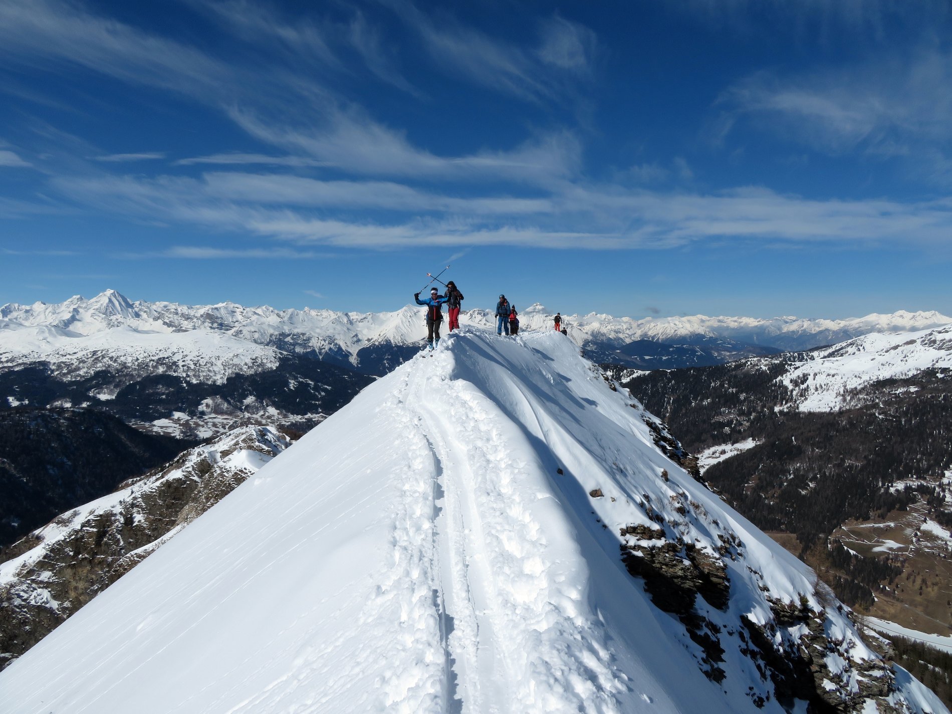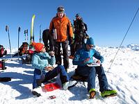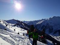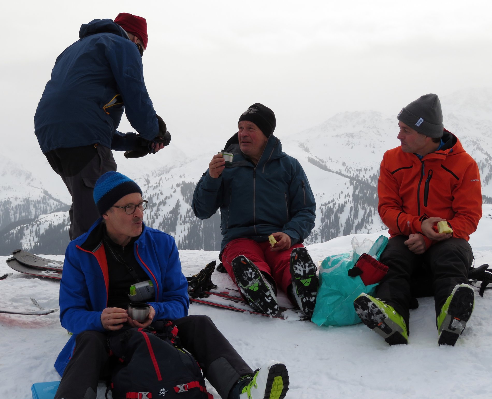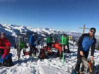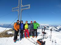 Wir hatten keine Eile und so genossen alle die ausgiebige Gipfelrast bei Sonnenschein und grandiosem Bergpanorama. Abgefahren sind wir durch ein weites nordseitiges Kar in direkter Linie hinunter ins Schmirntal. Und das bei Pulverschnee fast bis zum Schluß. Da hätte wohl keiner drauf gewettet.
